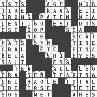 ACROSS 1. Fast planes 5. Personal question 8. Disorderly crowd 11. Become fatigued 12. Polynesian shrub of the pepper family 14. Connecticut Ivy Leaguer 15. Removes the wrinkles 17. Eucharist need 18. Teachers' org. 19. Small, flat, pigmented spot on the skin 21. Eastern Standard Time (abbr.) 22. Two (Sp.) 23. Compass dir. 24. Grand Old Party 25. Ocean 27. Born 28. Jazz singing style 31. Floor coverings 35. Symbol (abbr.) 37. Prong on a fork 38. Relating to the mouth 39. And so on (abbr.) 41. Inactive volcano in Sicily 42. Actor Lugosi 43. _ Lanka 45. Snake ____ (dice throw) 46. Table seasoning 47. Curvy letter 49. Beverage made from leaves 51. 100% 52. Lion 55. Epoch 57. Elected rep. 60. Separating forcefully 62. Set 63. White Person, in Hawaii 65. "_____ Recall" 66. Binary compound 67. Celtic language 68. False hair 69. Distress signal 70. Fish or hair follower 71. Ancient Greek god of war DOWN 1. Vertical member of a panel or frame 2. Fathers 3. Heavy duty weighing machine 4. Emitted 5. Alias (abbr.) 6. Yard entry 7. Nights before holidays 8. Ananias' fault 9. Margarine 10. Prejudice 13. Pismires 16. Attach a signature 17. Wimpy's pal 20. Moves 26. First name in cosmetics 29. Queen of England 1702-14 30. Beverages made from leaves 31. Disorderly crowds 32. Length times width 33. Baron Munchausen's specialties 34. Schedule 36. Mountains (abbr.) 40. Make 44. Small island 48. Narrow board 50. American tennis player Robert 52. 61 cubic inches 53. Related on the mother's side 54. Stares at amorously 55. Armor plate that protects the chest 56. Redecorate 58. Merit 59. Olfactory organ 61. Roll call or roster of names 64. Allow