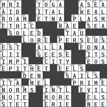 ACROSS 1. Medical imaging device (abbr.) 4. Ancient Roman robe 8. At sea 12. Help 13. Slanted text style (abbr.) 14. Welt 15. Wander 17. Inactive volcano in Sicily 18. Suffix with ecto or cyto 19. Principle of right and wrong 21. Actress Charlotte 23. Ocean 24. Having a sole or soles 26. The 19th letter of the Greek alphabet 28. Old wives' tales, e.g. 30. Son of Zeus who helped slay Medusa 34. Eastern Standard Time (abbr.) 37. Silent film actress Nazimova 39. Pulitzer Prize-winning author Ferber 40. Cards in a Roman deck? 41. Honkers 43. It is 44. Body of Kaffir warriors 46. Municipality 47. Greek goddess of the dawn 48. Curse 51. Snakelike fish 54. Lair 55. Moves on water 58. Call ___ day 61. Cartoonist voice _ Blanc 63. A-one 65. Typical models 67. International (abbr.) 71. Morally bad or wrong 72. Brief written record 73. Greater amount 74. Raised railways 75. Proofreading order 76. 4th largest of the Great Lakes 77. Born DOWN 1. Female horse 2. Disturbances 3. Potato state 4. Neckwear 5. Baseball player Mel 6. Separate the seeds from cotton 7. Having or resembling wings 8. Leather borer 9. Oceans 10. Relaxation 11. _ mater 16. Place where flour is made 18. Lightbulb-shaped fruit 20. Corporate head (abbr.) 22. Had dinner 25. To trail on the ground 27. Purpose 29. Opt 30. Thick mixture 31. Singer Brickell 32. To (old English) 33. Backtalk 34. Writer Wiesel 35. Simple or foolish person 36. Native american tent (variation) 38. Flowery wreath 42. Snake ____ (dice throw) 45. It would 49. Is hesitant and indecisive 50. Compass dir. 52. Infant locale 53. Father 56. Make or become more lively 57. Grin 58. Lodging establishments 59. A blast of a horn 60. Johnson of "Laugh-In" 62. Citrus frut 64. Otherwise 66. Was introduced to 68. Not either 69. Three (prefix) 70. Area sheltered from the wind