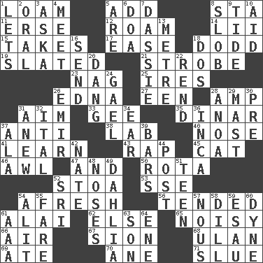 ACROSS 1. Rich soil 5. Say or write further 8. R.R. building 11. Celtic language 12. Wander aimlessly 14. Cards in a Roman deck? 15. Proceeds 17. Comfort 18. Texas town _ City 19. Scheduled 21. Disco prop 23. Tired old horse 25. Angers 26. Pulitzer Prize-winning author Ferber 27. Car or cant ending 28. Electrical Unit 31. Direct toward a target or goal 33. Turn to the right 35. Middle Eastern gold or silver currency 37. Against 38. Experiment locale 40. Olfactory organ 41. Memorize 43. Reproach for some lapse or misdeed 45. Feline 46. Leather borer 47. Plus 50. Round or rotation of duties 52. Portico 53. Compass dir. 54. Anew 56. Watched over 61. Jai ____ 62. Otherwise 65. Annoyingly loud 66. Atmosphere 67. The Jewish people; Israel 68. ____ Bator, Mongolia 69. Had dinner 70. One (Scot) 71. Change direction abruptly DOWN 1. Allows 2. Spoken 3. "____ silly question..." 4. Confront 5. "We ___ not amused" (Victoria) 6. ___ good deed 7. Small ungulate mammals of Africa 8. Messy guy 9. Event that recurs at intervals 10. Assist 13. Distance measurement (Brit.) 16. Post 18. Two (Sp.) 20. Mild oath, euphamism for damn 22. Tear apart 24. Highlander 26. Arab leader 28. Small Philippine buffalo 29. Vertical spar for supporting sails 30. Before (prefix) 31. Afresh 32. Slanted text style (abbr.) 34. Ewer handle 36. South American Indian 37. In the manner of 39. Taverns 42. Nathan's nickname 44. Mail 48. Olfactory organs 49. A pale violet or amethyst color 51. Adolescent 52. _ Lanka 54. Set down 55. Conductor's collection 57. Horse sense 58. Deli pickle 59. Son of Isaac 60. Centimeter-gram-second unit of force 61. American Automobile Association (abbr.) 63. Male offspring 64. Compass dir.