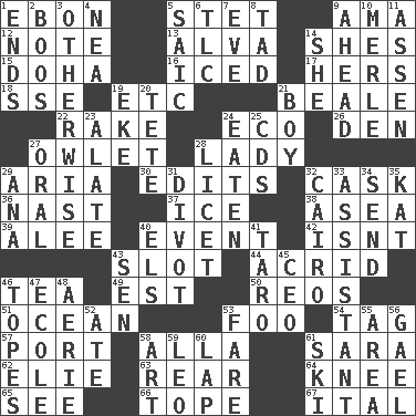 ACROSS 1. Inky black, to poets 5. Proofreading order 9. Wet nurse (var.) 12. Musical sound 13. Inventor's middle name 14. "______ My Girl" (Turtles hit) 15. Capital of the state of Qatar 16. On the rocks 17. Possessive pronoun 18. Compass dir. 19. And so on (abbr.) 21. Memphis, Tenn. Street 22. Immoral or dissolute person 24. Environmental prefix 26. Lair 27. A small or young owl 28. Kenny Rogers chart-topper in '80 29. Operatic vocal solo 30. Proofreads 32. Keg 36. Political cartoonist Thomas 37. Frozen water 38. Toward the sea 39. Toward shelter 40. Happening 42. Is not 43. Narrow opening 44. Sour-tasting 46. Beverage made from leaves 49. Eastern Standard Time (abbr.) 50. Vintage cars 51. Sea 53. Egg _ yung 54. Label 57. Sweet dark-red dessert wine 58. Silent film actress Nazimova 61. "Two Mules for Sister ____" 62. Writer Wiesel 63. Bring up, as a child 64. Leg joint 65. Perceive with the eye 66. Drink excessively 67. Slanted text style (abbr.) DOWN 1. Extremities 2. Scornful sounds 3. Else 4. Teachers' org. 5. Ketch in the Levant 6. Affectionate concern, for short 7. Night before a holiday 8. Small boy 9. Toward the future 10. Haggard of country music 11. NE Netherlands city 14. A female animal or person 19. Make supply last 20. False hair 21. Male child 23. Having winglike extensions 24. Ingested 25. Music discs 27. Spoken 28. It is permitted: Lat. 29. Santa ___, CA 31. A piece of turf (Scot.) 32. Capital of Egypt 33. Helper 34. Post 35. Krazy ___ of comics 40. Raised railways 41. Edible starchy tuberous root 43. Elected rep. 45. Corporate head (abbr.) 46. Drinks excessively 47. Learning spot: Fr. 48. Nest on high 52. Had dinner 53. Conductor's collection 55. Length times width 56. Highlander 58. Nonscientific branch of learning 59. Lion 60. Pet locale 61. What Jean-Claude Killy likes to do