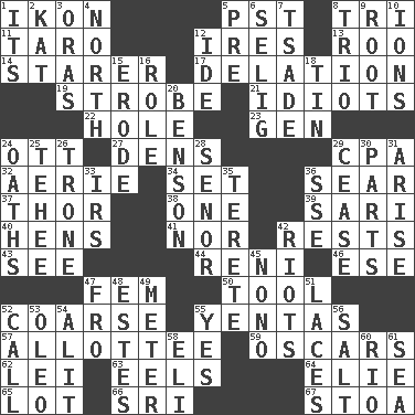 ACROSS 1. Picture 5. Pacific Standard Time (abbr.) 8. Three (prefix) 11. Pacific island yam 12. Angers 13. Friend of Pooh 14. A viewer who gazes fixedly 17. Conveyance 19. Disco prop 21. Foolish or stupid persons 22. Hollow 23. Commissioned military rank (abbr.) 24. Baseball player Mel 27. Habitations of wild animals 29. Tax preparer (abbr.) 32. Nest on high 34. Put into a specified state 36. Scorch 37. Son of Odin 38. Single 39. Indian skirt 40. Coop moms 41. Not either 42. Musical pauses 43. Observe 44. Painter Guido (1575-1642) 46. Compass dir. 47. Opposite of masc. 50. Instrument 52. Rough 55. Gossips 57. One to whom something is allotted 59. Motion picture awards 62. Flowery wreath 63. Snakelike fish 64. Writer Wiesel 65. Car dealer's back yard 66. Indian title of respect (Mr.) 67. Portico DOWN 1. ___ a Wonderful Life 2. Krazy ___ of comics 3. Mouths or openings 4. _ pole 5. Before (prefix) 6. Major League Baseball Commissioner Bud 7. Sadhe (variant) 8. Musical group of three 9. Carrot, for example 10. Charged particles 12. Binary compound 15. Eat (away) 16. Hero or heavy, e.g. 18. Metal container 20. Gillaume's butler role 24. Expletives 25. Giggle 26. Heavy duty weighing machine 28. Sir (Sp.) 29. Stop 30. Pieces 31. Get up 33. Big collection agency 35. Cylindrical with tapered ends 36. Compass dir. 42. Disturbances 45. Words to Nanette 47. From 48. _____ Park, CO 49. Distance measurement 51. Shoestrings 52. Give a ring to 53. Butter sub 54. Set down 55. It is so 56. Table seasoning 58. Biblical high priest 60. River (Sp.) 61. Ocean