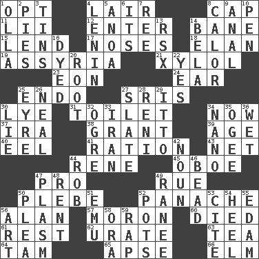 ACROSS 1. Elect 4. Den 8. Head covering 11. Cards in a Roman deck? 12. Keyboard key 14. Object of repulsion 15. Grant temporary use of 17. Olfactory organs 18. Flair 19. Nineveh was its capital 21. Xylene (variant) 23. Period of immesurable duration 24. Hearing organ 25. Inside; within (prefix) 27. Indian titles of respect 30. Potassium hydroxide 31. Rest room 34. At this time 37. Retirement account (abbr.) 38. Let have 39. Grow older 40. Snakelike fish 41. Food allowance for one day 43. Fish or hair follower 44. French philosopher Descartes 45. Mitch Miller's instrument 47. Adept person 49. Regret 50. Military trainee 52. Flamboyance 56. Actor Alda or Thicke 57. Person of subnormal intelligence 60. Passed on 61. Repose 62. A salt of uric acid 63. Beverage made from leaves 64. Scottish cap 65. Domed church section 66. Shade tree DOWN 1. Spanish pot 2. Sliced desserts 3. Metal containers 4. Soviet premier 1918-24 5. Small Philippine buffalo 6. It is 7. To separate or throw off 8. Bodily heat indicating an inflammation 9. Of or related to the anus 10. Writing instrument 13. Acura sports coupe 14. Actor Lugosi 16. Colored 20. Carrot, for example 22. It is so 25. Jane of fiction 26. Actress Patricia 27. Chalkboard 28. Painter Guido (1575-1642) 29. "Tell ____ the Marines!" 30. Untruth 32. Legendary monster 33. SW Asia republic 34. Billionth: prefix 35. Double curve, resembling the letter S 36. Dripping 42. Part of speech 44. Director Reiner 46. Necklace unit 47. Suffix with ecto or cyto 48. Monthly bill 49. The wife of a rajah (variant) 50. Entreaty 51. Australian flightless bird 52. Cooking vessels 53. Quote 54. The bottom of a shoe or boot 55. Dutch treat 56. Nonscientific branch of learning 58. Mouth or opening 59. Hit sharply and swiftly