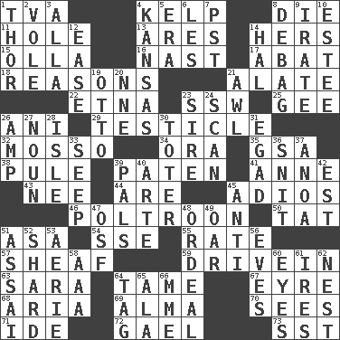 ACROSS 1. Federal power corp. 4. Seaweed 8. Expire 11. Opening into or through something 13. Ancient Greek god of war 14. Possessive pronoun 15. Spanish pot 16. Political cartoonist Thomas 17. Blind as ____ 18. Thinks logically 21. Having winglike extensions 22. Inactive volcano in Sicily 23. Compass dir. 25. Turn to the right 26. Cuckoo 29. One of the two male reproductive glands 32. With motion or animation 34. Mouth or opening 35. Girls' org. (abbr.) 38. Whimper 39. Eucharist need 41. Singer Murray 43. Born 44. "We ___ not amused" (Victoria) 45. Goodbye (Sp.) 46. Characterized by complete cowardliness 50. Make lace 51. White ___ sheet 54. Compass dir. 55. Pace 57. Archer's quiver 59. Popular '50s hangout 63. "Two Mules for Sister ____" 64. Not wild 67. Jane of fiction 68. Roberta Peters solo 69. _ mater 70. Perceives with the eye 71. Binary compound 72. Highlander 73. Fast jet (abbr.) DOWN 1. Son of Odin 2. Short-tailed, large-bodied rat 3. Silent film actress Nazimova 4. Sunflower state 5. Period 6. French article 7. Pacific Standard Time (abbr.) 8. Debunk (Brit. slang) 9. Feeling or showing extreme anger 10. First name in cosmetics 12. Relaxation 14. Actor Linden 19. "Beetle Bailey" pooch 20. Compass dir. 21. Leather borer 23. The founder of a family 24. Skim 26. Electrical Unit 27. Part of speech 28. Capri or Wight 30. Carrier 31. Mild oath 33. Ooze 36. In a ____ (agitated or irritated) 37. Small Philippine buffalo 39. Friends 40. Johnson of "Laugh-In" 42. Eastern Standard Time (abbr.) 45. Against 47. Order of Saint Francis (abbr.) 48. Severe or trying experience 49. Boat paddle 51. Slender Brazilian palm 52. Pottery fragment 53. Nest on high 56. Nights before holidays 58. American Automobile Association (abbr.) 60. Snake ____ (dice throw) 61. Angers 62. Egg locale 64. Label 65. According to 66. Madame (abbr.)