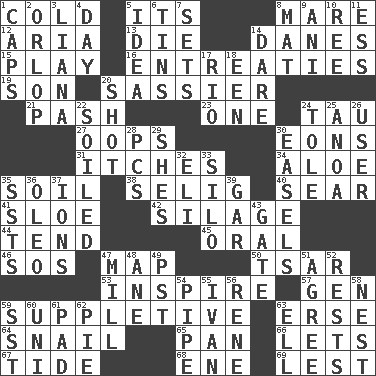 ACROSS 1. Chilled 5. It is 8. Female horse 12. Operatic vocal solo 13. Pass on 14. Natives or inhabitants of Denmark 15. Shaw product 16. Pleas 19. Male child 20. More impudent 21. Romantic infatuation 23. Single 24. The 19th letter of the Greek alphabet 27. I made a mistake 30. Immeasurably long periods of time 31. Strong, restless desires 34. Medicinal plant 35. The visible part of the earth's surface 38. Former Milwaukee Brewers owner Bud 40. Shrivel 41. _ gin 42. Fodder prepared in a silo 44. Be inclined (to) 45. Spoken 46. Distress signal 47. Atlas unit 50. Russian ruler of old 53. Motivate 57. Commissioned military rank (abbr.) 59. Supplementary 63. Celtic language 64. Slow-paced one 65. Baking dish 66. Allows 67. Event that recurs at intervals 68. Compass dir. 69. For fear that DOWN 1. Balmoral and tarboosh 2. Lowest deck of a ship 3. Woody, climbing, usually tropical plant 4. 24 hours 5. The content of cognition 6. Metal containers 7. Arranges properly for use 8. Floor covering 9. Black tropical American cuckoo 10. To riddle 11. Curvy letter 14. Have the gumption 17. _ de Janeiro 18. Car or cant ending 20. Opportunity 22. Dirtied 24. Lacquered or enameled metalware 25. Small Philippine buffalo 26. One who makes use of a thing 28. Personal Computers (abbr.) 29. "______ My Girl" (Turtles hit) 30. Artist's stands 32. Connecticut Ivy Leaguer 33. Grain storage tower 35. Fast planes 36. Butter sub 37. Charged atoms 39. Slender fish 43. Yard entry 47. Place where flour is made 48. One (Scot) 49. Pacific Standard Time (abbr.) 51. Match 52. Musical pauses 54. Corncob 55. "Terrible" tsar 56. French philosopher Descartes 58. Egg locale 59. Fast jet (abbr.) 60. Single; one (prefix) 61. Groovy apt. 62. Sliced dessert 63. Pipe bend