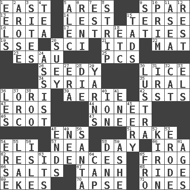 ACROSS 1. Compass direction 5. Ancient Greek god of war 9. Practice fight 13. 4th largest of the Great Lakes 14. For fear that 15. Laconic 16. Globular water bottle used in Asia 17. Pleas 19. Compass dir. 20. _-fi 21. It would 22. Floor covering 23. He sold his birthright 25. Personal Computers (abbr.) 26. Full of seeds 30. Louse (plural) 34. Damascus' land 35. Mountain range 36. Australian parrot (variant) 39. Nest on high 42. Fast planes 43. Greek god of love 44. Music written for nine 46. Native of Scotland 47. Scornful expression 48. Followers of ems 51. Libertine 54. Connecticut Ivy Leaguer 57. Teachers' org. 58. 24 hours 60. Retirement account (abbr.) 62. Homes 65. Toadlike animal 66. Table seasonings 67. Hyperbolic tangent 68. Travel on or in a vehicle 69. Makes supply last 70. Domed church section 71. Washington bills DOWN 1. Snakelike fish 2. Came up 3. Settings 4. Afternoon social gathering 5. Actor Baldwin 6. Painter Guido (1575-1642) 7. Eastern Standard Time (abbr.) 8. Empty completely 9. Put into a specified state 10. Demure 11. At sea 12. Respite 15. Small boys 18. And so on (abbr.) 20. Chop _ 24. Help 27. Period 28. Pass on 29. Entertaining tales 30. A period of five years 31. Big collection agency 32. Feline 33. Raised railways 36. French article 37. The grampus (Milton) 38. Friend of Pooh 40. Electrically charged atom 41. Compass dir. 45. Suggestive of the supernatural 48. Extremities 49. Born 50. Before Barbara or Clara 52. Japanese brewing company 53. Eat (away) 54. Celtic language 55. Path through which fluid escapes 56. Capri or Wight 58. Cub Scout units 59. American tennis player Robert 61. Matures 63. ___ a Wonderful Life 64. Head covering 65. Away