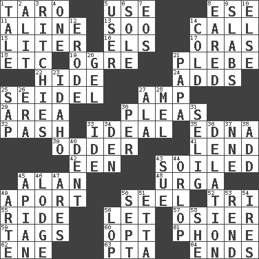 ACROSS 1. Edible starchy tuberous root 5. Purpose 8. Compass dir. 11. Place in a line 13. "Barney Miller" actor Jack 14. Give a ring to 15. 61 cubic inches 16. Raised railways 17. Mouths or openings 18. And so on (abbr.) 19. Legendary monster 21. First-year military academy student 22. Flintstone garb 24. Sums up 25. Beer mug 27. Electrical Unit 29. Length times width 30. Entreaties 32. Romantic infatuation 33. Standard of perfection 35. Pulitzer Prize-winning author Ferber 39. More peculiar 41. Grant temporary use of 42. Car or cant ending 43. Dirtied 45. Actor Alda or Thicke 48. Capital and largest city of Mongolia 49. To the left, to Queeg 50. Sew up the eyelids of hawks and falcons 52. Three (prefix) 55. Travel on or in a vehicle 56. Allow 57. Flexible twig of a willow tree 59. Labels 60. Choose 61. Give a jingle 62. Compass dir. 63. Parent Teacher Association (abbr.) 64. Conclusions DOWN 1. Falsehood 2. Set down 3. Actors Guy, Robert Welles, and Clint 4. Single 5. One who makes use of a thing 6. Not divided or shared with others 7. Greek goddess of the dawn 8. Having ears or earlike features 9. Broad, flat, thick pieces 10. Otherwise 12. Wear away 14. Lacking warmth 20. Set 21. Dad 23. Potato state 25. Plant excrement 26. Epoch 27. Chicken ___ king 28. Cartoonist voice _ Blanc 30. For each 31. Former Milwaukee Brewers owner Bud 33. Binary compound 34. Lair 36. Accusation by an informer 37. Compass dir. 38. Find the sum of 40. Gouge 43. Institute legal proceedings 44. Fourth or lowest deck 45. Bee-related 46. Cabin 47. Ancient Greek god of war 49. Johnson of "Laugh-In" 50. Back-to-school mo. 51. Singer James 53. Tear apart 54. Angers 56. Trim (branches) 58. A female animal or person