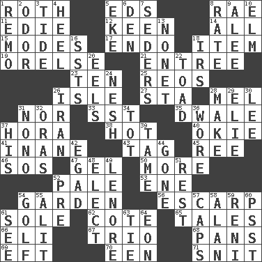 ACROSS 1. Writer of Portnoy's Complaint (1969) 5. Begley and Asner 8. Actress Charlotte 11. Singer Brickell 12. Peachy ____! 14. 100% 15. Methods 17. Inside; within (prefix) 18. A whole individual unit 19. Threatening words 21. Main course 23. Nine, plus one 25. Vintage cars 26. Small island 27. R.R. building 28. Cartoonist voice _ Blanc 31. And not 33. Fast jet (abbr.) 35. A sleeping potion; an opiate (poet.) 37. Israeli folk dance 38. Being at a high temperature 40. Migrant worker of the '30s 41. Silly 43. Label 45. To separate or throw off 46. Mayday 47. Set 50. Greater amount 52. Light colored 53. Compass dir. 54. Place where plants grow 56. Fortification 61. Not divided or shared with others 62. ____ d'Azur (French Riviera) 65. Falsehoods 66. Connecticut Ivy Leaguer 67. Musical group of three 68. Baking dishes 69. Bank Draft (abbr.) 70. Car or cant ending 71. In a ____ (agitated or irritated) DOWN 1. San ____ (Riviera town) 2. Aroma 3. Event that recurs at intervals 4. The bottom of a shoe or boot 5. Supplement with great effort 6. Lair 7. Spring feasts 8. Pace 9. Toward shelter 10. Shade tree 13. Music written for nine 16. Fast planes 18. Big collection agency 20. Snakelike fish 22. Frog relative 24. Delicate 26. SW Asia republic 28. Create 29. Writer Wiesel 30. Area sheltered from the wind 31. Words to Nanette 32. Mouths or openings 34. Small child 36. Had on 37. Part of HMS, perhaps 39. Not wild 42. Mild oath 44. Went 48. Opt 49. Poe poem 51. Relief 52. Before (prefix) 54. Eighteen holes 55. Came down and settled, as after flight 57. Smile enhancers 58. Actor Alda or Thicke 59. Painter Guido (1575-1642) 60. Inconspicuous attention getter 61. Observe 63. Make a knot 64. A really long time