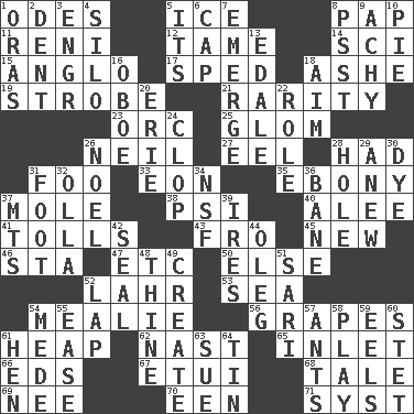ACROSS 1. Lyric poems 5. Frozen water 8. Infant food 11. Painter Guido (1575-1642) 12. Not wild 14. _-fi 15. White American of non-Hispanic descent 17. Drove too fast 18. American tennis player Robert 19. Disco prop 21. Noteworthy scarcity 23. The grampus (Milton) 25. Take by theft 26. Famous astronaut Armstrong 27. Snakelike fish 28. Possessed 31. Egg _ yung 33. A really long time 35. Dark wood 37. Undercover agent 38. 23rd letter of the Greek alphabet 40. Toward shelter 41. For Whom the Bell _____ 43. From 45. ___ Haven, CT 46. R.R. building 47. And so on (abbr.) 50. Otherwise 52. Cowardly lion portrayer 53. Ocean 54. Ear of corn 56. Wine fruits 61. Pile 62. Political cartoonist Thomas 65. An arm off of a larger body of water 66. Begley and Asner 67. Needle holder 68. Falsehood 69. Born 70. Car or cant ending 71. System (abbr.) DOWN 1. Mouths or openings 2. Gouge 3. Engineer (abbr.) 4. Grain storage tower 5. ___ a Wonderful Life 6. Head covering 7. Develop 8. Inconspicuous attention getter 9. Painful 10. Sliced dessert 13. Peak District village in England 16. Mitch Miller's instrument 18. Direct toward a target or goal 20. One of the Great Lakes 22. Hero or heavy, e.g. 24. Hoof sound 26. Christmas carol 28. Hollow 29. Afresh 30. Color 31. Pick up the tab 32. Spanish pot 34. Science/research agcy. 36. Object of repulsion 37. Mountains (abbr.) 39. Angers 42. Lick closed 44. Cassini of fashion 48. One or ones belonging to thee 49. Cause to be 51. Indian skirt 52. Pet locale 54. Ancient Persian 55. Comfort 57. Pismires 58. Live dramatic performance 59. Snakelike fish 60. Proofreading order 61. Layer 63. Take to court 64. Metal container