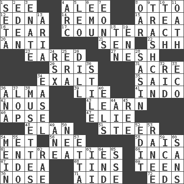 ACROSS 1. Perceive with the eye 4. Toward shelter 8. Von Bismarck 12. Pulitzer Prize-winning author Ferber 14. San ____ (Riviera town) 15. Type of rug 16. Pull apart 17. Act in opposition 20. Against 21. Elected rep. 22. Quiet! 23. Having ears or earlike features 27. Soft 29. Indian titles of respect 31. Land measure 34. Honor 35. Ketch in the Levant 36. _ mater 39. Whopper 41. Southeast Asian peninsula 42. Common sense 43. Acquire or gain knowledge or skills 46. Domed church section 47. Writer Wiesel 48. Enthusiasm 51. Navigate 54. Was introduced to 56. Born 58. Raised platform 61. Pleas 66. South American Indian 67. The content of cognition 68. Canisters 69. Adolescent 70. Characteristic smell of wine 71. Helper 72. Begley and Asner DOWN 1. Bristle 2. Locale of original sin 3. Maternal 4. Curve 5. Lion 6. Australian flightless bird 7. Immeasurably long periods of time 8. Rowing implement 9. File 13 10. Technology 11. Pledge 13. Operatic vocal solo 18. Nine, plus one 19. Compass dir. 24. Acura sports coupe 25. Epoch 26. Deli pickle 28. Indian antelope 30. Vertical member of a panel or frame 32. To free from 33. Environmental prefix 34. Artist's stand 36. Santa ___, CA 37. Trim (branches) 38. French bagpipes 40. Snakelike fish 44. Small island 45. To riddle 49. A saturated hydrocarbon 50. Teachers' org. 52. Prepare for publication 53. Indian princess (variant) 54. Count _ (2 wds.) 55. Inside; within (prefix) 57. Singer James 59. On the rocks 60. Without 62. Actress Charlotte 63. One more than two 64. Conclude 65. Compass dir.