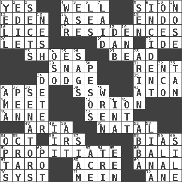 ACROSS 1. It is so 4. Water source 8. The Jewish people; Israel 12. Paradise 14. At sea 15. Inside; within (prefix) 16. Louse (plural) 17. Dwellings 20. Allows 21. One of the 12 tribes of Israel 22. Binary compound 23. Imelda's hoard 27. Necklace unit 29. Fastener 31. Monthly bill 34. Evade 35. South American Indian 36. Domed church section 39. Compass dir. 41. Tiny particle 42. Confront 43. Greek mythologigal hunter 46. Queen of England 1702-14 47. Posted 48. Roberta Peters solo 51. Relating to or accompanying birth 54. Sep. follower 56. Big collection agency 58. Prejudice 61. Appease 66. Indonesian resort city 67. Edible starchy tuberous root 68. Measure of real estate 69. Of or related to the anus 70. System (abbr.) 71. Count _ (2 wds.) 72. One (Scot) DOWN 1. Shout 2. Singer Brickell 3. Religious groups 4. Armed conflict 5. Compass dir. 6. French article 7. Put down 8. Elected rep. 9. Event 10. Wrote a lyric poem 11. Olfactory organ 13. Tender 18. Small moist lump or mass 19. Compass dir. 24. Bear (Spanish) 25. Conclusion 26. Droops 28. Believer in; advocate of (suffix) 30. Mexican monetary units 32. Non-commissioned officer (abbr.) 33. Scottish cap 34. Prevent from occurring 36. Nursemaid (var.) 37. Fenced enclosure 38. Legislators 40. Songbird 44. _ tizzy (2 wds.) 45. Baseball player Mel 49. One more than two 50. Tate display 52. Swedish rock group 53. Woody, climbing, usually tropical plant 54. Chooses 55. Supercomputer manufacturer 57. Thailand, formerly 59. Actor Alda or Thicke 60. Drop; flow; fall 62. Plant holder 63. Adept person 64. Three (prefix) 65. Car or cant ending