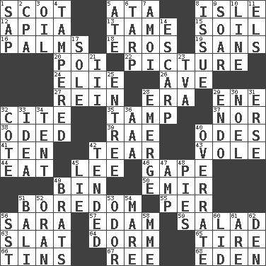 ACROSS 1. Native of Scotland 5. "One Day ___ Time" 8. Capri or Wight 12. Capital of Western Samoa 13. Docile 15. Land 16. Insides of hands 18. Greek god of love 19. Without 20. Luau course 22. Photo 24. Writer Wiesel 26. "___ Maria" 27. It's straight from the horse's mouth 28. Epoch 29. Compass dir. 32. Quote 35. Pack (down) 37. And not 38. Wrote a lyric poem 39. Actress Charlotte 40. Lyric poems 41. Nine, plus one 42. Rend 43. Short-tailed, large-bodied rat 44. Consume 45. Area sheltered from the wind 46. Open wide 49. Storage container 50. Independent ruler or chieftain 51. Mood resulting from idleness 55. For each 56. "Two Mules for Sister ____" 57. Dutch treat 59. First course 63. Narrow board 64. Dormintory (informal) 65. Become fatigued 66. Airtight sealed metal containers 67. To sift 68. Genesis locale DOWN 1. Plant excrement 2. Accounting whiz (abbr.) 3. Lubricate 4. ________ with (broke a safety seal) 5. Had dinner 6. Canvas cover 7. Mine, in Marseilles 8. Come out of 9. Fly high 10. Actor's bit 11. Raised railways 14. Fortification 17. Flatfish 21. One more than two 23. Federal power corp. 25. Main course 28. Develop 29. Inside; within (prefix) 30. Christmas carol 31. Celtic language 32. ____ d'Azur (French Riviera) 33. It may be bright or harebrained 34. Portable shelter 36. American Automobile Association (abbr.) 40. Make much ado about nothing 42. Watched over 45. Untruth 47. Electrical Unit 48. Sliced desserts 49. Naughty children 51. Indonesian resort city 52. Northwest Algerian city 53. Scent 54. Female horse 56. Fast jet (abbr.) 58. Madame (abbr.) 60. Flaplike covering 61. "We ___ not amused" (Victoria) 62. Lair
