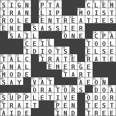 ACROSS 1. Omen 5. Parent Teacher Association (abbr.) 8. Clement's nick name 12. SW Asia republic 13. Mouth edge 14. Damp 15. Hero or heavy, e.g. 16. Pleas 19. Compass dir. 20. More lively and spirited 21. Travel by water 23. Single 24. Numbers guy (abbr.) 27. To provide with a ceiling 30. Utensil 31. Foolish or stupid persons 34. Otherwise 35. Baby powder 38. Feeling or showing extreme anger 40. Assign a rank or rating to 41. Of or related to the anus 42. Develop 44. Method 45. Small pie 46. Declare 47. Large container 50. A really long time 53. Speakers 57. ___ good deed 59. Supplementary 63. Scent 64. Distinguishing feature 65. Fenced enclosure 66. Trial 67. Assistant 68. Indiana (abbr.) 69. Relationship diagram DOWN 1. Title for a man of rank and authority 2. Removes the wrinkles 3. An organ shaped like a helmet 4. Compass dir. 5. Entreaty 6. Airtight sealed metal containers 7. Tenement units (abbr.) 8. Small bed 9. Cards in a Roman deck? 10. Compass dir. 11. Mountains (abbr.) 14. Female horse 17. River (Sp.) 18. Car or cant ending 20. Downhill vehicle 22. Tapering mass of hanging ice 24. Root beer relative 25. Mail 26. Toward shelter 28. One more than two 29. Old wives' tales, e.g. 30. Cylindrical with tapered ends 32. Scottish cap 33. Proofreading order 35. Scottish caps 36. Small Philippine buffalo 37. Kenny Rogers chart-topper in '80 39. Period 43. Pate de foie ____ 47. Electrical Unit 48. "We ___ not amused" (Victoria) 49. Make lace 51. More peculiar 52. Trap for birds or small mammals 54. Native american tent (variation) 55. Baking chamber 56. Tear apart 58. Johnson of "Laugh-In" 59. R.R. building 60. RI univ. 61. Writing tablet 62. Sliced dessert 63. Baseball player Mel