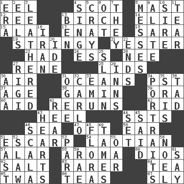 ACROSS 1. Snakelike fish 4. Highlander 8. Vertical spar for supporting sails 12. To sift 13. A tree used for making furniture 14. Writer Wiesel 15. Mountain range southwest of Kyrgyzstan 17. Maternal 18. "Two Mules for Sister ____" 19. Slender, wiry 21. Of or pertaining to yesterday 23. Possessed 24. Curvy letter 26. Born 27. French philosopher Descartes 28. Flaplike coverings 30. Atmosphere 31. Seas 34. Pacific Standard Time (abbr.) 37. Mature 38. Street urchin 39. Mouth or opening 40. Assist 41. Summer TV shows 42. To free from 43. The bottom of a shoe or boot 44. Fast planes 46. Ocean 47. Often (poetically) 50. Hearing organ 51. Fortification 54. Of or relating to Laos or its people 57. Having or resembling wings 58. Scent 60. "Vaya con ____" 62. Table seasoning 63. More valued for its uncommonness 64. Beverage made from leaves 65. It was, poetically 66. Afternoon social gatherings 67. Playfully artful DOWN 1. Period 2. Snakelike fish 3. Tough but pliablecoriaceous 4. Scorch 5. Trading vessels 6. Sep. follower 7. Those people 8. Makes clutter 9. Having winglike extensions 10. Male parent of an animal 11. Pull apart 13. Benjamin's nick name 16. SW Asia republic 20. Binary compound 22. Extremities 25. Killed 27. Swiss mountan, "Queen of the Mountains" 29. Taverns 30. Auto club (abbr.) 31. Double curve, resembling the letter S 32. Monte _, Las Vegas Hotel/Casino 33. Australian flightless bird 34. Likenesses of persons 35. Indian titles of respect 36. Small boy 41. Hitchcock's "____ Window" 43. Centers 44. Arrange properly for use 45. Stated 46. Any of the three canals of the cochlea 48. Plants 49. Corrects by punishment or discipline 51. 90 degrees 52. Cole _ (cabbage dish) 53. Piece 55. Rowing implement 56. Christmas carol 59. Actress Charlotte 61. Declare