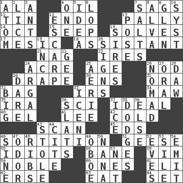 ACROSS 1. In the manner of 4. Petroleum 7. Droops 11. Metal container 12. Inside; within (prefix) 13. Chummy 14. Sep. follower 15. Ooze 16. Finds the solution 17. Mesonic 19. Aide 21. Tired old horse 23. Angers 24. Measure of real estate 25. Personal question 26. Dreamland 29. Window treatment 30. Followers of ems 31. Mouth or opening 32. Container for groceries 33. Big collection agency 34. Informal term for the mouth 35. Lyricist Gershwin 36. _-fi 37. Standard of perfection 40. Set 41. Area sheltered from the wind 42. Lacking warmth 43. Skim 45. Begley and Asner 46. Decision 51. Honkers 55. Foolish or stupid persons 56. Object of repulsion 58. Zeal 59. Impressive in appearance 60. Singles 61. Connecticut Ivy Leaguer 62. Celtic language 63. Consume 64. Arrange properly for use DOWN 1. Tiny particle 2. Louse (plural) 3. Pismires 4. Single 5. The content of cognition 6. Chops off 7. Table seasonings 8. Inventor's middle name 9. Small, secluded valley 10. System (abbr.) 12. Fortification 13. Introduce or present, as a question 16. Titles for men of rank and authority 18. South American Indian 20. Signals 22. Turn to the right 24. Therefore, facetiously 25. Nest on high 26. Wanderer 27. Spoken 28. Obsolete 29. Have the gumption 32. Massive 33. Ancient Celtic tribe of eastern Britain 36. Narrow boards 37. Frozen water 38. Evades 39. Otherwise 43. Fur scarf 44. Quote 46. Trig term 47. Aroma 48. Chest bones 49. Mitch Miller's instrument 50. Grandmother 52. Nights before holidays 53. Drop; flow; fall 54. Give off 57. Fish or hair follower