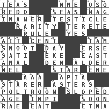 ACROSS 1. Afternoon social gatherings 5. Compass dir. 8. Bear (Spanish) 11. Make new 12. Oceans 13. Tired old horse 14. More empty; more void 17. A testis 19. Noteworthy scarcity 21. Cigar-shaped 22. Court order 23. Affirmative reply 24. Small island 27. Penny 29. Scottish cap 32. Snob 34. 24 hours 36. Celtic language 37. Suttee (variant) 38. Make supply last 39. Compass direction 40. Of or related to the anus 41. Lair 42. Tree or shrub in the Birch family 43. Cartoonist voice _ Blanc 44. Play the lead 46. Compass dir. 47. Auto club (abbr.) 50. Capital of Western Samoa 52. A viewer who gazes fixedly 55. Michaelmas daisies 57. Coward 59. Inclined 62. Ripen 63. Body of Kaffir warriors 64. Within a short period 65. Actress Charlotte 66. Erode 67. Inactive volcano in Sicily DOWN 1. Three (prefix) 2. Car or cant ending 3. The sixth month of the Jewish calendar 4. Underwater navigation system 5. Born 6. Thoroughly unpleasant 7. First name in cosmetics 8. At one time in the past 9. Table seasoning 10. Double curve, resembling the letter S 12. Filthy place 15. Spew [out] 16. Cause heat under the collar 18. Big collection agency 20. Looked after 24. Indian state 25. Empty; void 26. "_____ Recall" 28. Receives possession of 29. Swap 30. NE Netherlands city 31. Distance measurement (Brit.) 33. Petroleum 35. Gossips 36. Snakelike fish 42. Satellite of Uranus 45. Flats, for short 47. Nonscientific branch of learning 48. Nest on high 49. Odor 51. Came up 52. Coast Guard woman 53. Ancient Roman robe 54. Toward shelter 55. Black tropical American cuckoo 56. Blemish 58. Choose 60. Period of immesurable duration 61. Heredity factor (abbr.)