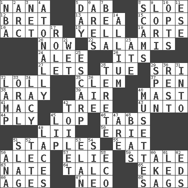 ACROSS 1. Grandmother 5. Small moist lump or mass 8. _ gin 12. Cy Young winner Saberhagen 13. Length times width 15. 911 reaches them 16. Thespian 18. Shout 19. Johnson of "Laugh-In" 20. At this time 22. Deli grouping 24. Toward shelter 26. It is 27. Allows 28. Third day of the wk. 29. Indian title of respect (Mr.) 32. Hang loosely or laxly 35. Clement's nick name 37. Animal enclosure 38. Like ___ of sunshine 39. Wind 40. Vertical spar for supporting sails 41. Apple computer (short form) 42. Family _ (genealogy) 43. To (old English) 44. Apply oneself diligently 45. Chop off 46. Bar bills 49. Cards in a Roman deck? 50. 4th largest of the Great Lakes 51. Paper fasteners 55. Ingest 56. Actor Baldwin 57. Writer Wiesel 59. Having lost freshness 63. Nathan's nickname 64. Baby powder 65. Supplemented with great effort 66. Grows older 67. Modern: prefix 68. Settles DOWN 1. Basketball assoc. 2. Curve 3. Fish or hair follower 4. Without tonality 5. 24 hours 6. Ancient Greek god of war 7. Actor Lugosi 8. Fraudulent business schemes 9. Australian parrot (variant) 10. Chooses 11. Compass dir. 14. Plant genus of onion and garlic 17. Hero or heavy, e.g. 21. Dripping 23. Had dinner 25. Fortification 28. Cylindrical with tapered ends 29. Connect, as a bridge 30. Remainder 31. To the inside or interior of 32. Desk light 33. Taken by mouth 34. Made of lace 36. Untruth 40. French bagpipes 42. Bathroom plumbing fixture 45. Mouth edge 47. "We ___ not amused" (Victoria) 48. Prejudice 49. Shoestrings 51. Volcanic refuse 52. False hair 53. Liveliness 54. Drop; flow; fall 56. Santa ___, CA 58. Environmental prefix 60. Alias (abbr.) 61. Part of a journey 62. Begley and Asner