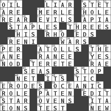 ACROSS 1. Lubricate 4. One who doesn't tell the truth 8. Proofreading order 12. "We ___ not amused" (Victoria) 13. Haggard of country music 14. Opening into or through something 15. Bring up, as a child 17. Vices 18. Capital of Western Samoa 19. Paper fasteners 21. Threesomes 23. Part of HMS, perhaps 24. 17th letter of the Greek alphabet 26. Begley and Asner 27. Painter Guido (1575-1642) 28. Armed conflicts 30. For each 31. Ringlike coral islands and reefs 34. Definite Article 37. A saturated hydrocarbon 38. Indian princess (variant) 39. Consenting reply 40. Allow head to fall sleepily 41. Cylindrical with tapered ends 42. Actress Charlotte 43. Oceans 44. Close up, plug up 46. Fish or hair follower 47. It is 50. Nervous spasm 51. Eats (away) 54. Pertaining to the sea 57. Hero or heavy, e.g. 58. Eucharist need 60. Prepare for publication 62. Play the lead 63. Baking chambers 64. Call ___ day 65. Immeasurably long periods of time 66. Trial 67. ___ Haven, CT DOWN 1. Rowing implement 2. Angers 3. Tough but pliablecoriaceous 4. Prying instrument 5. From or relating to Ireland 6. Everything 7. Respite 8. Pottery fragments 9. Drinks excessively 10. Writer Wiesel 11. Afternoon social gatherings 13. Cartoonist voice _ Blanc 16. Water falling in drops from the sky 20. 23rd letter of the Greek alphabet 22. Possessive pronoun 25. A small or young owl 27. Former U.S. Attorney General Janet 29. Toward shelter 30. Baking dish 31. Length times width 32. Tarsus (plural) 33. Single 34. Polypeptide antibiotic 35. Pile 36. Compass dir. 41. Wig 43. Spring feasts 44. R.R. building 45. Prong on a fork 46. Pitcher Ryan 48. Lugs 49. Odor 51. Celtic language 52. Printing process, for short 53. Specific locale 55. Followers of ems 56. Quote 59. "___ Maria" 61. The 23rd letter of the Hebrew alphabet