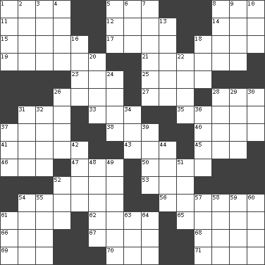 ACROSS 1. Mine, in Marseilles 5. Epoch 8. The grampus (Milton) 11. Dunce 12. Plant excrements 14. River (Sp.) 15. Assad's deity 17. Back-to-school mo. 18. Desk light 19. Ear of corn 21. Artist's stands 23. 24 hours 25. Flats, for short 26. Past tense of be (plural) 27. 17th letter of the Greek alphabet 28. Bear (Spanish) 31. Compass dir. 33. Secret 35. Following 37. Johnson of "Laugh-In" 38. Flowery wreath 40. Singer James 41. Streamer paper 43. _-fi 45. Greek goddess of the dawn 46. Eastern Standard Time (abbr.) 47. Two (Sp.) 50. Mild oath 52. Moving, as bait 53. Spanish title 54. Spoke pompously 56. Nomad 61. Fastener 62. Monthly bill 65. Ascend 66. Sep. follower 67. Family _ (genealogy) 68. Enthusiasm 69. Born 70. R.R. building 71. Change direction abruptly DOWN 1. First of billions? 2. Undercover agent 3. Spanish pot 4. Slanted text style (abbr.) 5. Double-curved letter 6. Actress Charlotte 7. Seem 8. Relating to the mouth 9. Basketball hoops 10. Police officer (slang) 13. Staphylococcus 16. Flintstone garb 18. French article 20. Hearing organs 22. Portico 24. Shout 26. Shed a tear 28. "Beetle Bailey" pooch 29. Arranges properly for use 30. Mouth or opening 31. Blunders 32. Proofreading order 34. Affirmative reply 36. Nourish 37. Adept person 39. On the rocks 42. Prepare for publication 44. Composer Stravinsky 48. Unconcealed 49. Spring feasts 51. Small Philippine buffalo 52. Infant locale 54. Single time 55. Assign a rank or rating to 57. Ancient Greek god of war 58. Place where flour is made 59. Son of Isaac 60. French philosopher Descartes 61. Male child 63. Fish or hair follower 64. Afternoon social gathering