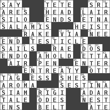 ACROSS 1. Declare 4. False hair 8. _ Lanka 11. Ancient Greek god of war 13. Froth on beer 14. Den 15. Grain storage tower 16. Conclusions 17. Inactive volcano in Sicily 18. Deli grouping 21. Robbery 22. Immoral or dissolute person 23. By way of 25. Born 26. Conclude 29. A testis 32. Moves on water 34. Actress Charlotte 35. Two (Sp.) 38. Inside; within (prefix) 39. Hold, grip (Informal) 41. Singer James 43. Wind 44. Fenced enclosure 45. Keyboard key 46. Plea 50. Baseball player Mel 51. Label 54. Curvy letter 55. "______ My Girl" (Turtles hit) 57. Odor 59. French poetic form 63. Thailand, formerly 64. Swiss mountan, "Queen of the Mountains" 67. The sixth month of the Jewish calendar 68. Lie 69. Lyric poems 70. Egg locale 71. Followers of ems 72. Waist strap 73. Had dinner DOWN 1. Backtalk 2. Operatic vocal solo 3. Shout 4. College papers 5. Car or cant ending 6. Bit 7. Begley and Asner 8. Smooth fabric 9. Wash lightly 10. Feeling or showing extreme anger 12. Fly high 14. Area sheltered from the wind 19. Floor protectors 20. D.D.E's nickname 21. Actor Linden 23. Small bottle 24. On the rocks 26. Compass dir. 27. Grandmother 28. "You Light Up My Life" star Conn 30. Marketplace scale 31. Genesis locale 33. Old wives' tales, e.g. 36. "Beetle Bailey" pooch 37. Proofreading order 39. Tenement units (abbr.) 40. Possessive pronoun 42. Nonscientific branch of learning 45. Snake ____ (dice throw) 47. Teachers' org. 48. Aid 49. Definite Article 51. Clothes sense 52. Believer in; advocate of (suffix) 53. Finish lines 56. Comedian Laurel of Laurel & Hardy 58. Madame (abbr.) 60. The main thing one is thinking about 61. Political cartoonist Thomas 62. Johnson of "Laugh-In" 64. Director Reiner 65. Binary compound 66. Set