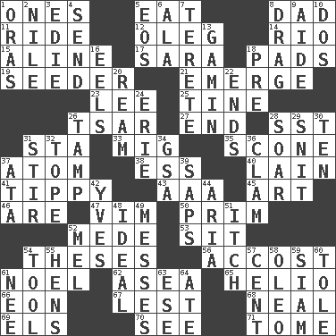 ACROSS 1. Singles 5. Ingest 8. June honoree 11. Travel on an animal 12. Cassini of fashion 14. _ de Janeiro 15. Place in a line 17. "Two Mules for Sister ____" 18. Writing tablets 19. Sowing specialist 21. Develop 23. Area sheltered from the wind 25. Prong on a fork 26. Russian ruler of old 27. Conclude 28. Fast jet (abbr.) 31. R.R. building 33. Russian fighter aircraft 35. Biscuitlike quick bread 37. Smallest unit of an element 38. Curvy letter 40. (Had) reclined 41. Likely to tip or tilt 43. Auto club (abbr.) 45. Nonscientific branch of learning 46. "We ___ not amused" (Victoria) 47. Zeal 50. Demure 52. Ancient Persian 53. Be seated 54. College papers 56. Buttonhole 61. Christmas carol 62. At sea 65. Sun: prefix 66. Period of immesurable duration 67. For fear that 68. Actress Patricia 69. Raised railways 70. Perceive with the eye 71. Heavy book DOWN 1. Mouths or openings 2. The longest river in the world 3. Singer Brickell 4. Post 5. Greek goddess of the dawn 6. According to 7. Cigar-shaped 8. To be drawn or hauled along 9. Helper 10. Two (Sp.) 13. Street urchin 16. Snakelike fish 18. Before (prefix) 20. 480, 500 or 516 sheets of paper 22. Extremities 24. 4th largest of the Great Lakes 26. Pack (down) 28. Fly high 29. In a ____ (agitated or irritated) 30. "___ Little Indians" 31. Use a spoon 32. Drink excessively 34. Girls' org. (abbr.) 36. Dollar (slang) 37. _ moment's notice (2 wds.) 39. Plant excrements 42. Jacques Cousteau's middle name 44. Operatic vocal solo 48. Perfect 49. Makes clutter 51. Hankering 52. Cartoonist voice _ Blanc 54. Utensil 55. Coop moms 57. Penny 58. Margarine 59. Thailand, formerly 60. Lacquered or enameled metalware 61. Born 63. Compass dir. 64. Had dinner