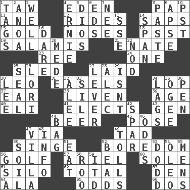 ACROSS 1. The 23rd letter of the Hebrew alphabet 4. Locale of original sin 8. Infant food 11. One (Scot) 12. Amusement-park features 14. Plant excrements 15. Gilt 17. Olfactory organs 18. Inconspicuous attention getter 19. Deli grouping 21. Related on the mother's side 23. To separate or throw off 24. Single 25. Downhill vehicle 27. Put down 30. Lion 31. Artist's stands 34. Chop off 37. Hearing organ 38. Make or become more lively 39. Personal question 40. Connecticut Ivy Leaguer 41. Chooses 43. Commissioned mil. rank 44. Fermented drink made from hops 45. Introduce or present, as a question 47. By way of 49. Bit 50. Burn superficially 52. Mood resulting from idleness 56. Eighteen holes 57. Satellite of Uranus 60. Not divided or shared with others 61. Grain storage tower 62. "_____ Recall" 63. Lair 64. According to 65. Likelihood 66. Two (Sp.) DOWN 1. Labels 2. Small Philippine buffalo 3. Not ill 4. Bert's buddy 5. "Vaya con ____" 6. Begley and Asner 7. Born 8. Thick mixture 9. Domed church section 10. Pacific Standard Time (abbr.) 13. Compass dir. 14. Connect, as a bridge 16. Have the gumption 20. Ancient Persian 22. Lower and raise head in agreement 25. Lick closed 26. Australian parrot (variant) 27. Prying instrument 28. Actor Baldwin 29. Is not 30. Area sheltered from the wind 32. Toward shelter 33. Filth; sediment 34. Fails to keep up a pace 35. Double curve, resembling the letter S 36. Fenced enclosure 42. Practice fight 44. Paper or plastic container 46. Lyric poems 47. Country estate 48. A message received and understood 49. For Whom the Bell _____ 50. The visible part of the earth's surface 51. Consume 52. Necklace unit 53. Texas town _ City 54. Butter sub 55. Not women's 56. Girls' org. (abbr.) 58. Friend of Pooh 59. It would
