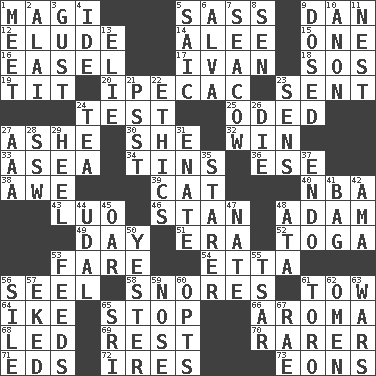 ACROSS 1. Wise men 5. Backtalk 9. Daniel's nick name 12. Evade 14. Toward shelter 15. Single 16. Artist's stand 17. "Terrible" tsar 18. Mayday 19. Teat (slang) 20. Medicinal drug used to evoke vomiting 23. Emitted 24. Trial 25. Wrote a lyric poem 27. American tennis player Robert 30. A female animal or person 32. Victory 33. At sea 34. Metal containers 36. Compass dir. 38. Deep reverence 39. Domesticated feline 40. Basketball assoc. 43. Nilotic language 46. Comedian Laurel of Laurel & Hardy 48. First of billions? 49. 24 hours 51. Epoch 52. Ancient Roman robe 53. Conductor's collection 54. Singer James 56. Sew up the eyelids of hawks and falcons 58. Sounds asleep 61. Pull behind 64. Eisenhower's nickname 65. Cease 66. Scent 68. Directed 69. Repose 70. More valued for its uncommonness 71. Begley and Asner 72. Angers 73. Immeasurably long periods of time DOWN 1. Rendezvous 2. Jai ____ 3. Abrupt rush of wind 4. Binary compound 5. Ketch in the Levant 6. Inventor's middle name 7. Manatee 8. Elected rep. 9. Administered medicine 10. At once, immediately (arch.) 11. Egg locale 13. Writer Wiesel 21. Inconspicuous attention getter 22. Value system 23. Elected reps. 24. Afternoon social gathering 26. Expire 27. Auto club (abbr.) 28. Compass dir. 29. The bottom of a shoe or boot 31. Related on the mother's side 35. A viewer who gazes fixedly 37. Inside; within (prefix) 41. Paper or plastic container 42. Nanny (var.) 44. Freehold land 45. Rowing implement 47. Nathan's nickname 48. "One Day ___ Time" 50. Last 53. Gives food to 55. Russian ruler of old 56. Drop; flow; fall 57. Made supply last 59. Sense of smell 60. Chooses 61. "Corrida" creature 62. Sign of things to come 63. Armed conflicts 65. Indian title of respect (Mr.) 67. Actress Charlotte