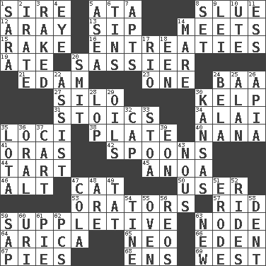 ACROSS 1. Male parent of an animal 5. "One Day ___ Time" 8. Turn sharply 12. Like ___ of sunshine 13. Small drink 14. Confronts 15. Libertine 16. Pleas 19. Had dinner 20. More lively and spirited 21. Dutch treat 23. Single 24. Sound made by sheep 27. Grain storage tower 30. Seaweed 31. Unemotional ones 34. Jai _ 35. Venues 38. Food holder 40. Nanny 41. Mouths or openings 42. Soup utensils 44. Small pie 45. Small Philippine buffalo 46. The first octave above the treble staff 47. Feline 50. One who uses or employs something 53. Speakers 57. To free from 59. Supplementary 63. Connecting point 64. N. Chile seaport 65. Modern: prefix 66. Locale of original sin 67. Sliced desserts 68. Followers of ems 69. Compass direction DOWN 1. "Two Mules for Sister ____" 2. Feeling or showing extreme anger 3. Moved through 4. Sight organ 5. At sea 6. Canisters 7. Tenement units (abbr.) 8. Put into a specified state 9. Luau accessory 10. Shoshoni 11. Double-curved letter 14. Female horse 17. _ de Janeiro 18. Car or cant ending 20. Stricken, poetically 22. Help 24. Actor Lugosi 25. Actor Alda or Thicke 26. Capital of Western Samoa 28. Trim (branches) 29. Lubricates 30. Sunflower state 32. Head covering 33. Portico 35. Globular water bottle used in Asia 36. Of the mouth 37. Draw slowly or heavily 39. Period of immesurable duration 43. Good sense 47. Root beer relative 48. "We ___ not amused" (Victoria) 49. Make lace 51. Wear away 52. Amusement-park features 54. Prong on a fork 55. Baking chamber 56. Vintage cars 58. Undesirable depression on a surface 59. Plant excrement 60. RI univ. 61. Sliced dessert 62. Personal Computers (abbr.) 63. ___ Haven, CT