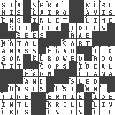 ACROSS 1. R.R. building 4. Small fatty European fish 9. Past tense of be (plural) 13. Part of HMS, perhaps 14. Capital of Egypt 15. Deliberation 16. Followers of ems 17. An arm off of a larger body of water 18. Citrus frut 19. Be seated 21. Afternoon social gathering 22. For Whom the Bell _____ 24. Perceives with the eye 26. Actress Charlotte 27. Relating to or accompanying birth 29. Haul 30. Collect or gather 31. Mild oath 33. Affectionate concern, for short 36. Male child 37. Turned at an angle; bent 40. Friend of Pooh 41. Teat (slang) 42. I made a mistake 43. Standard of perfection 45. Merit 47. Woody, climbing, usually tropical plant 48. Added to 49. Downhill vehicle 50. Fertile tracts in a desert 52. Eastern Standard Time (abbr.) 54. Madame (abbr.) 56. Become fatigued 57. Bert's buddy 59. Binary compound 61. International (abbr.) 62. Shrimp-like planktonic crustaceans 63. 54 in ancient Rome 64. Makes supply last 65. _____ Park, CO 66. Area sheltered from the wind DOWN 1. A female animal or person 2. Airtight sealed metal containers 3. Helper 4. _-fi 5. Leg coverings 6. Cause heat under the collar 7. Length times width 8. Small child 9. Place for singles 10. Tending to cause great harm 11. Basketball hoops 12. Compass dir. 20. Beverages made from leaves 22. Exchange 23. Boat paddle 25. Otherwise 27. Political cartoonist Thomas 28. Mine, in Marseilles 29. Crow sounds 31. Inky black, to poets 32. Republican Party 33. Excercise machine 34. Grant temporary use of 35. Root beer relative 38. Titled peers of a realm 39. Deli pickle 44. South Vietnam president (1954) 45. Artist's stands 46. One (Scot) 49. Vertical member of a panel or frame 50. Pig sound 51. Johnson of "Laugh-In" 52. Blunders 53. In a ____ (agitated or irritated) 55. Singer Brickell 56. Make a knot 57. Make supply last 58. Raised railways 60. Night before a holiday