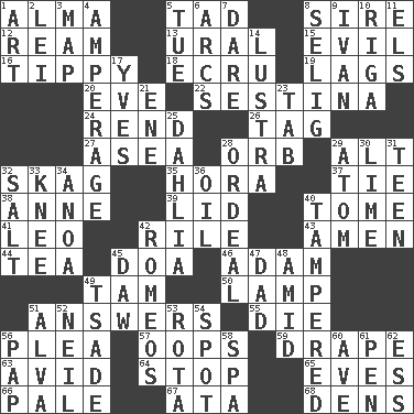 ACROSS 1. _ mater 5. Small boy 8. Title for a man of rank and authority 12. 480, 500 or 516 sheets of paper 13. Mountain range 15. Morally bad or wrong 16. Likely to tip or tilt 18. Shade of tan 19. Fails to keep up a pace 20. First lady 22. French poetic form 24. Tear apart 26. Label 27. Toward the sea 28. Globe 29. The first octave above the treble staff 32. Heroin 35. Israeli folk dance 37. Make a knot 38. Queen of England 1702-14 39. Flaplike covering 40. Heavy book 41. Lion 42. Cause heat under the collar 43. So be it 44. Afternoon social gathering 45. ___ good deed 46. First man 49. Scottish cap 50. Desk light 51. Replies (to) 55. Expire 56. Entreaty 57. I made a mistake 59. Window treatment 63. Enthusiastic 64. Close up, plug up 65. Nights before holidays 66. Diluted with white 67. _ moment's notice (2 wds.) 68. Lairs DOWN 1. Nonscientific branch of learning 2. Flowery wreath 3. Atlas unit 4. Electrical Measurement 5. Third day of the wk. 6. Arches 7. Have the gumption 8. Former Milwaukee Brewers owner Bud 9. _ the terrible 10. Capital of Latvia 11. Raised railways 14. A period of five years 17. Jacques Cousteau's middle name 21. Compass dir. 23. Bar bill 25. A pale violet or amethyst color 28. Severe or trying experience 29. Smallest unit of an element 30. Citrus frut 31. Adolescent 32. Table seasoning 33. Leg joint 34. Small Philippine buffalo 36. Petroleum 40. ________ with (broke a safety seal) 42. Lover boys 45. Fool 47. June honoree 48. Among 49. Sadhe (variant) 51. Inventor's middle name 52. Famous astronaut Armstrong 53. Round or rotation of duties 54. Specific locale 56. Infant food 58. Health resort 60. "___ Maria" 61. Animal enclosure 62. Curvy letter