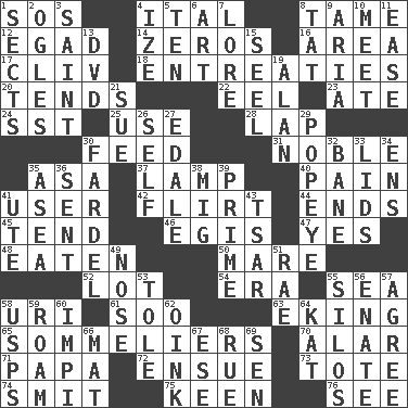 ACROSS 1. Mayday 4. Slanted text style (abbr.) 8. Not wild 12. Mild oath 14. Nothings 16. Type of rug 17. 154 in Roman numerals 18. Pleas 20. Watches over 22. Snakelike fish 23. Had dinner 24. Fast jet (abbr.) 25. Purpose 28. Infant locale 30. Nourish 31. Having high moral qualities 35. White ___ sheet 37. Desk light 40. Ache 41. One who uses or employs something 42. Seductive woman who exploits men 44. Extremities 45. Look after 46. Armor plate that protects the chest 47. It is so 48. Consumed 50. Female horse 52. Car dealer's back yard 54. Epoch 55. Ocean 58. RI univ. 61. "Barney Miller" actor Jack 63. Supplementing with great effort 65. Wine waiters 70. Having or resembling wings 71. Dad 72. Take place subsequently 73. Carry 74. Stricken, poetically 75. Peachy ____! 76. Perceive with the eye DOWN 1. Religious groups 2. Stares at amorously 3. Inhabitant of Heaven 4. Ending with capital 5. Nine, plus one 6. Tate display 7. Old wives' tales, e.g. 8. Make lace 9. Operatic vocal solo 10. Rendezvous 11. Comfort 13. Movie disc 15. Stitch closed the eyes of (a falcon) 19. Actor Alda or Thicke 21. Take to court 26. Oneself 27. Peak District village in England 29. Wimpy's pal 30. Pack 32. Object of repulsion 33. Flaplike coverings 34. Followers of ems 35. Toward the sea 36. Transmitted 38. Russian fighter aircraft 39. First class 41. Shoshoni 43. Russian ruler of old 49. Sense of smell 51. Actress Charlotte 53. Lacquered or enameled metalware 55. Grain storage towers 56. Related on the mother's side 57. Match 58. United States Postal Service (abbr.) 59. Wander 60. Body of Kaffir warriors 62. Pig sound 64. Krazy ___ of comics 66. Floor covering 67. Compass dir. 68. Sorrow 69. Elected rep.