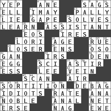 ACROSS 1. Slangy assent 4. One (Scot) 7. Droops 11. Pipe bend 12. "If ____ say so..." 13. Friendly 14. Falsehood 15. Yawn 16. Finds the solution 17. Memorize 19. Aide 21. Greek goddess of the dawn 23. Angers 24. Australian parrot (variant) 25. Personal question 26. Sorrow 29. Failure 30. Followers of ems 31. Bear (Spanish) 32. Separate the seeds from cotton 33. Big collection agency 34. Lair 35. Oval reproductive body of a fowl 36. _-fi 37. Having gotten out of bed 40. Curvy letter 41. Area sheltered from the wind 42. Distinctive style or manner 43. Glance over 45. Wind 46. Conclusion 51. Debunk (Brit. slang) 55. Foolish or stupid persons 56. Assign a rank or rating to 58. Santa ___, CA 59. Having high moral qualities 60. Of or related to the anus 61. Remaining after all deductions 62. Celtic language 63. Tired old horse 64. She-sheep DOWN 1. Shout 2. Writer Wiesel 3. Entreaty 4. Nursemaid (var.) 5. California wine valley 6. Sight organs 7. Table seasonings 8. Inventor's middle name 9. Small, secluded valley 10. System (abbr.) 12. Dismiss 13. Introduce or present, as a question 16. Titles for men of rank and authority 18. Vintage cars 20. Omens 22. Title for a knight 24. Yearns 25. Nest on high 26. "The Thinker" sculptor 27. One who uses or employs something 28. A really long time 29. Straggles 32. Unit of force equal to gravity 33. Ancient Celtic tribe of eastern Britain 36. Narrow boards 37. Actress Gardner 38. A glass for beer 39. Become fatigued 43. Fur scarf 44. Quote 46. Trig term 47. Aroma 48. Teases 49. NW Algerian seaport 50. Nanny 52. Object of repulsion 53. Afresh 54. Yard entry 57. Label