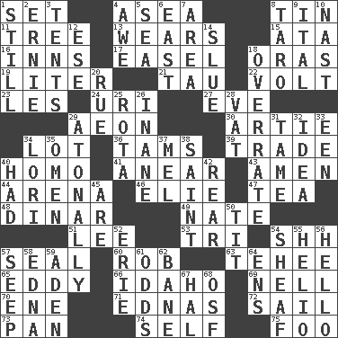 ACROSS 1. Put into a specified state 4. Toward the sea 8. Shallow baking pan 11. Woody plant 13. Puts on (as clothing) 15. "One Day ___ Time" 16. Lodging establishments 17. Artist's stand 18. Mouths or openings 19. 61 cubic inches 21. The 19th letter of the Greek alphabet 22. Electrical Unit 23. French article 24. RI univ. 27. First lady 29. Period of immesurable duration 30. Nick name for Arthur 34. Car dealer's back yard 36. Scottish caps 39. Barter 40. Same (prefix) 41. Approach 43. So be it 44. Sports stadium 46. Writer Wiesel 47. Beverage made from leaves 48. Middle Eastern gold or silver currency 49. Nathan's nickname 51. Area sheltered from the wind 53. Three (prefix) 54. Quiet! 57. Lick closed 60. Director Reiner 63. Giggle 65. Whirlpool 66. Potato state 69. 1994 drama film starring Jodie Foster 70. Compass dir. 71. Ferber et al. 72. Travel by water 73. Baking dish 74. Oneself 75. Egg _ yung DOWN 1. Free of sound 2. Bert's buddy 3. Portable shelters 4. Deep reverence 5. Ocean 6. Compass direction 7. Type of rug 8. Edible starchy tuberous root 9. Slanted text style (abbr.) 10. Political cartoonist Thomas 12. Compass dir. 14. Change direction abruptly 18. Make much ado about nothing 20. Sorrow 25. Roll call or roster of names 26. Lacking in sense or substance 28. Large container 29. Lacking a tonal center or key 31. Docile 32. The content of cognition 33. Car or cant ending 34. Australian parrot (variant) 35. Presage 37. Cartoonist voice _ Blanc 38. Virtuous person 40. Possessed 42. Posterior 45. "We ___ not amused" (Victoria) 50. Teat (slang) 52. 4th largest of the Great Lakes 54. To gather and bind into a bundle 55. Sun: prefix 56. Phone greeting 57. Ooze 58. Pulitzer Prize-winning author Ferber 59. An important port of Yemen 61. Probability 62. Object of repulsion 64. Followers of ems 67. Actor Linden 68. Order of Saint Francis (abbr.)