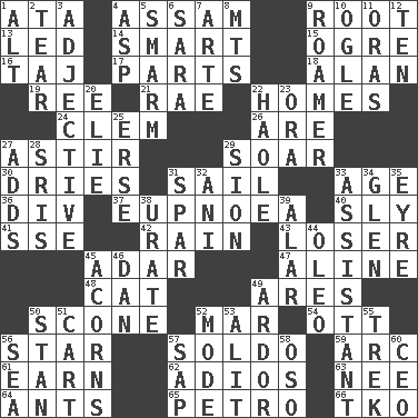 ACROSS 1. "One Day ___ Time" 4. Indian state 9. Carrot, for example 13. Directed 14. Don Adams' spy role 15. Legendary monster 16. _ Mahal 17. Actors' quests 18. Actor Alda or Thicke 19. To riddle 21. Actress Charlotte 22. Dwellings 24. Clement's nick name 26. "We ___ not amused" (Victoria) 27. Being in motion 29. Fly high 30. Frees from moisture 31. Move on water 33. Grow older 36. HTML Container Element 37. Normal relaxed breathing 40. Cunning 41. Compass dir. 42. Precipitation 43. Failure 45. The sixth month of the Jewish calendar 47. Place in a line 48. Domesticated feline 49. Ancient Greek god of war 50. Biscuitlike quick bread 52. Make imperfect 54. Baseball player Mel 56. Play the lead 57. Twentieth part of a lira 59. Curve 61. Merit 62. Goodbye (Sp.) 63. Born 64. Pismires 65. Stone: prefix 66. Ring climax DOWN 1. Keyboard modifier key 2. Pull apart 3. Descriptive word 4. Viper 5. Excessive but superficial compliments 6. "Two Mules for Sister ____" 7. Johnson of "Laugh-In" 8. Mountains (abbr.) 9. Nomad 10. Stare 11. Mouths or openings 12. Nine, plus one 20. Writer Wiesel 22. White Person, in Hawaii 23. Mouth or opening 25. Celtic language 27. Does sums 28. Indian titles of respect 29. The Jewish people; Israel 31. Coast Guard woman 32. Cuckoo 33. Aide 34. Small, secluded valley 35. Jane of fiction 38. A salt of uric acid 39. Having or resembling wings 44. Butter sub 45. Oak nuts 46. Daniel's nick name 49. Zeal 50. Comedian Laurel of Laurel & Hardy 51. Heavy open wagon 52. Method 53. Set down 55. Long journey 56. Ocean 57. Plant excrement 58. Bear (Spanish) 60. Corporate head (abbr.)