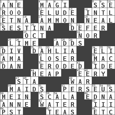 ACROSS 1. A saturated hydrocarbon 4. Wise men 8. Compass dir. 11. Friend of Pooh 12. Evade 14. International (abbr.) 15. Inactive volcano in Sicily 17. ID or VA city 18. Anneal 19. French poetic form 21. Put off 23. Sep. follower 24. And not 25. Citrus frut 27. Sums up 30. HTML Container Element 31. Mexican or Central American flower 34. Biblical high priest 37. Nursemaid (var.) 38. Failure 39. Apple computer (short form) 40. Daniel's nick name 41. Worn away 43. Binary compound 44. Pile 45. Suggestive of the supernatural 47. R.R. building 49. Armed conflict 50. Women servants 52. Son of Zeus who helped slay Medusa 56. Count _ (2 wds.) 57. Any of the three canals of the cochlea 60. Pulitzer Prize-winning author Ferber 61. Singer Murray 62. Wetness 63. One more than two 64. Pacific Standard Time (abbr.) 65. Afternoon social gatherings 66. And so on (abbr.) DOWN 1. Ancient Greek god of war 2. Brief written record 3. Immeasurably long periods of time 4. Intended 5. _ mater 6. Chewing product 7. Wedding promise 8. Scornful expression 9. Play the lead 10. Pipe bend 13. Conclude 14. A message received and understood 16. Tiny particle 20. On the rocks 22. Followers of ems 25. Pale green bean 26. _ the terrible 27. Columnist Joseph or Stewart 28. Passed on 29. Have the gumption 30. Male parent 32. Toward shelter 33. Israeli folk dance 34. Independent ruler or chieftain 35. Kenny Rogers chart-topper in '80 36. Frozen water 42. Letter starter 44. Possessed 46. Celtic language 47. Inhabitant of Heaven 48. Prong on a fork 49. Erodes 50. Not women's 51. Compass dir. 52. Entreaty 53. Singer Brickell 54. A single undivided whole 55. Ketch in the Levant 56. Atlas unit 58. Feline 59. Had dinner