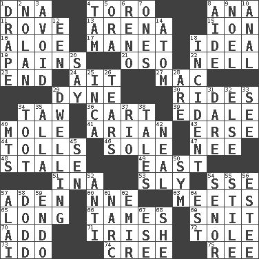 ACROSS 1. Heredity factor (abbr.) 4. "Corrida" creature 8. Santa ___, CA 11. Be footloose 13. Sports stadium 15. Electrically charged atom 16. Medicinal plant 17. French painter Edouard 18. It may be bright or harebrained 19. Aches 21. Bear (Spanish) 22. 1994 drama film starring Jodie Foster 23. Conclusion 24. Small island 27. Big _ 29. Unit of force 30. Amusement-park features 34. The 23rd letter of the Hebrew alphabet 36. Haul 39. Peak District village in England 40. Undercover agent 41. Believer in; advocate of (suffix) 43. Celtic language 44. For Whom the Bell _____ 46. Not divided or shared with others 47. Born 48. Showing deterioration from age 49. Compass direction 51. _ tizzy (2 wds.) 53. Wily 54. Compass dir. 57. Arabian gulf 60. Compass dir. 63. Confronts 65. Having great length 66. Corrects by punishment or discipline 69. In a ____ (agitated or irritated) 70. Find the sum of 71. From or relating to Ireland 72. Lacquered or enameled metalware 73. Wedding promise 74. Algonquian 75. To separate or throw off DOWN 1. Window treatment 2. Pitcher Ryan 3. Prevent from happening 4. Scottish cap 5. Mouth or opening 6. Former U.S. Attorney General Janet 7. Washington bills 8. Assistant 9. Christmas carol 10. Of or related to the anus 12. Car or cant ending 14. Smallest unit of an element 18. Event 20. Declare 25. South American Indian 26. Pulls into pieces 28. "We ___ not amused" (Victoria) 29. Residence 31. Have the gumption 32. Otherwise 33. Observe 34. A blast of a horn 35. Silent film actress Nazimova 37. River (Sp.) 38. Stories 40. Mountains (abbr.) 42. Actress Patricia 45. Elected rep. 50. Symbol (abbr.) 52. Opposed to 54. Sir (Sp.) 55. Vertical member of a panel or frame 56. First name in cosmetics 57. Jai _ 58. Texas town _ City 59. Inside; within (prefix) 61. Drug cop 62. Arab leader 64. Eastern Standard Time (abbr.) 67. Compass dir. 68. A female animal or person