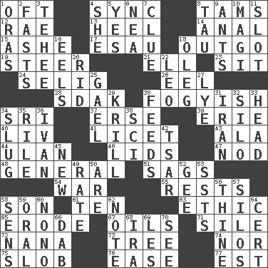 ACROSS 1. Often (poetically) 4. Synchronize (abbr.) 8. Scottish caps 12. Actress Charlotte 13. The bottom of a shoe or boot 14. Of or related to the anus 15. American tennis player Robert 17. Son of Isaac 18. Outlay 19. Guide 21. Pipe bend 23. Be seated 24. Former Milwaukee Brewers owner Bud 26. Snakelike fish 28. Neighbor of Neb. 30. Out of fashion; old fashioned 34. Indian title of respect (Mr.) 37. Celtic language 39. One of the Great Lakes 40. 54 in ancient Rome 41. It is permitted: Lat. 43. Chicken ___ king 44. ____ Bator, Mongolia 46. Hats (slang) 47. Dreamland 48. Commissioned military rank 51. Sinks 54. Armed conflict 55. Musical pauses 58. Manchild 61. Nine, plus one 63. Moral principle 65. Eat (away) 67. Lubricates 71. Filth; sediment 72. Nanny 73. Relationship diagram 74. And not 75. Oscar Madison type 76. Relaxation 77. Eastern Standard Time (abbr.) DOWN 1. Mouths or openings 2. Goes without food and/or water 3. Giggle 4. A female animal or person 5. Affirmative reply 6. Teachers' org. 7. A slight indication 8. The 19th letter of the Greek alphabet 9. Pismires 10. Wise men 11. Notch 16. Snakelike fish 18. Cassini of fashion 20. To free from 22. Lion 25. Highlander 27. Sodium hydroxide 29. Shrimp-like planktonic crustaceans 30. Gives food to 31. SW Asia republic 32. Grain storage tower 33. Froth on beer 34. Strike heavily 35. Cause heat under the collar 36. _ the terrible 38. _-fi 42. Russian ruler of old 45. ___ Haven, CT 49. Assign a rank or rating to 50. "We ___ not amused" (Victoria) 52. Turn to the right 53. Fast planes 56. One or ones belonging to thee 57. Grain storage towers 58. Elected reps. 59. Of the mouth 60. Words to Nanette 62. Make mention of 64. Certainty 66. Apply (a substance) by light strokes 68. Retirement account (abbr.) 69. French article 70. Observe