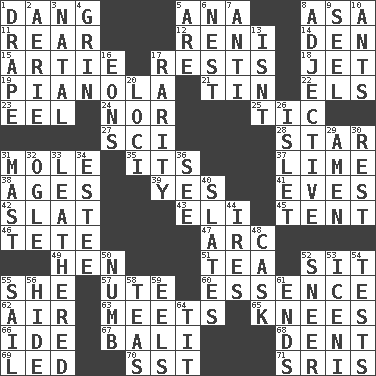 ACROSS 1. Mild oath, euphamism for damn 5. Santa ___, CA 8. White ___ sheet 11. Stern 12. Painter Guido (1575-1642) 14. Lair 15. Nick name for Arthur 17. Musical pauses 18. Type of plane 19. Player piano 21. Metal container 22. Raised railways 23. Snakelike fish 24. And not 25. Nervous spasm 27. _-fi 28. Play the lead 31. Undercover agent 35. ___ a Wonderful Life 37. Citrus frut 38. Eons 39. Consenting reply 41. Nights before holidays 42. Narrow board 43. Connecticut Ivy Leaguer 45. Portable shelter 46. Wig 47. Curve 49. Layer 51. Beverage made from leaves 52. Be seated 55. A female animal or person 57. Shoshoni 60. Gist 62. Atmosphere 63. Confronts 65. Leg joints 66. Binary compound 67. Indonesian resort city 68. Gouge 69. Directed 70. Fast jet (abbr.) 71. Indian titles of respect DOWN 1. Window treatment 2. Nest on high 3. Brizilian seaport 4. Broad smile 5. "We ___ not amused" (Victoria) 6. Egg locale 7. Against 8. Descriptive word 9. Sew up the eyelids of hawks and falcons 10. Pismires 13. Is not 16. Immeasurably long periods of time 17. Noteworthy scarcity 20. Venues 26. Small island 29. So be it 30. Relief 31. Vertical spar for supporting sails 32. Stare at amorously 33. Tough but pliablecoriaceous 34. First name in cosmetics 36. Perceive with the eye 40. Chalkboards 44. Angers 48. Keg 50. Unfeeling 52. Contemptuous expression 53. Ancient Celtic tribe of eastern Britain 54. Trials 55. Travel by water 56. Flintstone garb 58. Afternoon social gatherings 59. Snakelike fish 61. Extremities 64. Teat (slang)