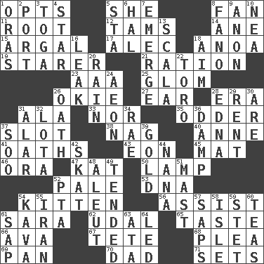 ACROSS 1. Elects 5. A female animal or person 8. Avid follower 11. Carrot, for example 12. Scottish caps 14. A saturated hydrocarbon 15. Therefore, facetiously 17. Actor Baldwin 18. Small Philippine buffalo 19. A viewer who gazes fixedly 21. Food allowance for one day 23. Auto club (abbr.) 25. Seize upon or latch onto something 26. Migrant worker of the '30s 27. Hearing organ 28. Epoch 31. In the manner of 33. And not 35. More peculiar 37. Narrow opening 38. Tired old horse 40. Singer Murray 41. Curses 43. A really long time 45. Floor protector 46. Mouth or opening 47. Krazy ___ of comics 50. Desk light 52. Light colored 53. Heredity factor (abbr.) 54. Baby cat 56. Aid 61. "Two Mules for Sister ____" 62. Allodial 65. Clothes sense 66. Actress Gardner 67. Wig 68. Entreaty 69. Baking dish 70. Male parent 71. Puts into a specified state DOWN 1. Mouths or openings 2. Left side of a ship or aircraft 3. Ancient Roman robe 4. Play the lead 5. R.R. building 6. Actor Linden 7. Develop 8. Papal veil 9. At once, immediately (arch.) 10. Teachers' org. 13. Any of the three canals of the cochlea 16. Path through which fluid escapes 18. Direct toward a target or goal 20. Precipitation 22. "Corrida" creature 24. A really long time 26. Pledge 28. Pulitzer Prize-winning author Ferber 29. Monthly bill 30. "We ___ not amused" (Victoria) 31. Having or resembling wings 32. Globular water bottle used in Asia 34. Actress Charlotte 36. Moist 37. "Barney Miller" actor Jack 39. Aureate 42. Three-handed card game 44. Nanny 48. Native American of Southwest Alaska 49. Looked after 51. Vertical spar for supporting sails 52. Parent Teacher Assoc. 54. Polynesian shrub of the pepper family 55. SW Asia republic 57. Plant excrements 58. Capri or Wight 59. Proofreading order 60. Afternoon social gatherings 61. Plant excrement 63. _ moment's notice (2 wds.) 64. Directed