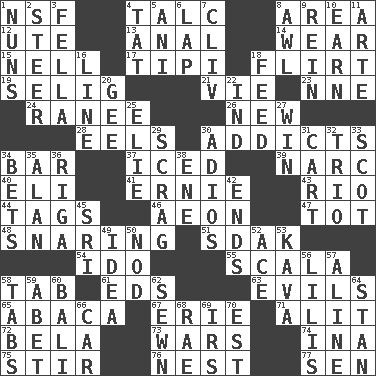 ACROSS 1. Overdraft (abbr.) 4. Baby powder 8. Length times width 12. Shoshoni 13. Of or related to the anus 14. Put on (as clothing) 15. 1994 drama film starring Jodie Foster 17. Native american tent (variation) 18. Talk or behave amorously 19. Former Milwaukee Brewers owner Bud 21. Compete 23. Compass dir. 24. Indian princess (variant) 26. ___ Haven, CT 28. Snakelike fish 30. Inveterate users 34. Soap unit 37. On the rocks 39. Drug cop 40. Biblical high priest 41. Bert's buddy 43. _ de Janeiro 44. Labels 46. Period of immesurable duration 47. Small child 48. Catching in a trap 51. Neighbor of Neb. 54. Wedding promise 55. Any of the three canals of the cochlea 58. Keyboard key 61. Begley and Asner 63. Vices 65. Phillipine bananalike plant 67. One of the Great Lakes 71. Came down and settled, as after flight 72. Actor Lugosi 73. Armed conflicts 74. _ tizzy (2 wds.) 75. Use a swizzle stick 76. Egg locale 77. Elected rep. DOWN 1. Religious women 2. Navigate 3. Chap (slang) 4. Make lace 5. Black tropical American cuckoo 6. Pet locale 7. 154 in Roman numerals 8. Leather borer 9. It's straight from the horse's mouth 10. Merit 11. Johnson of "Laugh-In" 16. Actor's bit 18. Nourish 20. Turn to the right 22. Indiana (abbr.) 25. Writer Wiesel 27. Victory 29. Lean end of the neck 30. Goodbye (Sp.) 31. Draw slowly or heavily 32. Musical group of three 33. Highlander 34. Wagers 35. Actor Alda or Thicke 36. Capital of Latvia 38. Compass dir. 42. Conclusions 45. Indian title of respect (Mr.) 49. The content of cognition 50. Allow head to fall sleepily 52. Adept person 53. Polynesian shrub of the pepper family 56. Ms. Damita and namesakes 57. Place in a line 58. Bar bills 59. Collude with 60. Indonesian resort city 62. Stitched 64. Comedian Laurel of Laurel & Hardy 66. 4-wheeled motor vehicle 68. Actress Charlotte 69. Big collection agency 70. Eastern Standard Time (abbr.)