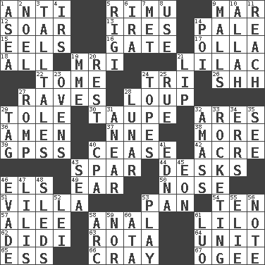 ACROSS 1. Against 5. Tall New Zealand timber tree 9. Third mo. 12. Fly high 13. Angers 14. Diluted with white 15. Snakelike fish 16. Yard entry 17. Spanish pot 18. 100% 19. Medical imaging device (abbr.) 21. Pale purple color 22. Heavy book 24. Three (prefix) 26. Quiet! 27. All-night dance parties 28. Central Nebraska county 29. Lacquered or enameled metalware 30. Grayish beige 32. Ancient Greek god of war 36. So be it 37. Compass dir. 38. Greater amount 39. Global Positioning Systems (abbr.) 40. Stop 42. Land measure 43. Coast Guard woman 44. Writing tables 46. Raised railways 49. Hearing organ 50. Olfactory organ 51. Country residence 53. Baking dish 54. Nine, plus one 57. Toward shelter 58. Of or related to the anus 61. _ and Stitch 62. "You Light Up My Life" star Conn 63. Round or rotation of duties 64. A single undivided whole 65. Double-curved letter 66. Supercomputer manufacturer 67. Double curve, resembling the letter S DOWN 1. Toward the sea 2. Christmas carol 3. Baron Munchausen's specialties 4. Big collection agency 5. Swiss mountan, "Queen of the Mountains" 6. Retirement account (abbr.) 7. Was introduced to 8. Purpose 9. Shopping centers 10. Assad's deity 11. Arrive at 14. Luau course 19. Madame (abbr.) 20. State of inaction 21. Mouth edge 23. Baking chambers 24. Drinks excessively 25. Sorrow 27. Play 28. Type of eclipse 29. Label 31. Approach 32. Collect or gather 33. Shooting up abruptly 34. Blunders 35. Perceive with the eye 40. Accounting whiz (abbr.) 41. Pulitzer Prize-winning author Ferber 43. Ocean 45. A really long time 46. Dodge 47. Ms. Damita and namesakes 48. Bobsleighs 52. Luau accessory 53. Live dramatic performance 55. Writer Wiesel 56. Short letter 58. Curve 59. And not 60. "One Day ___ Time" 61. Nilotic language