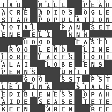 ACROSS 1. The 19th letter of the Greek alphabet 4. Place where flour is made 8. Lightbulb-shaped fruit 12. Land measure 14. Goodbye (Sp.) 16. Stare at amorously 17. Play the lead 18. Census information 20. Add up to 22. Baking dish 23. Arrange properly for use 24. Compass dir. 25. Biblical high priest 28. Compass dir. 30. Parka part 31. Artist's stand 35. Friend of Pooh 37. Grant temporary use of 40. Actor's bit 41. Old wives' tales, e.g. 42. Shoestrings 44. Farming town in central California 45. Mountain range southwest of Kyrgyzstan 46. Ear part 47. Followers of ems 48. Actor Sean's family 50. A single undivided whole 52. Thick or sticky substance 54. Fast jet (abbr.) 55. Pacific Standard Time (abbr.) 58. Allow 61. _ tizzy (2 wds.) 63. Lacking originality or spontaneity 65. The property of being fit to eat 70. Brightly colored fish 71. Assistant 72. Gospel singer Marvin 73. Wig 74. Peachy ____! 75. Songbird 76. Portuguese money of account (variant) DOWN 1. Clothes sense 2. Gambison 3. A salt of uric acid 4. Atlas unit 5. Wedding promise 6. Mouth edge 7. Central Nebraska county 8. Plant holder 9. The front part of a cuirass 10. Medicinal plant 11. Monthly bill 13. Period 15. Cole _ (cabbage dish) 19. Queen of England 1702-14 21. Lion 26. Hang loosely or laxly 27. Perfect 29. Place for singles 30. Cultivating 32. The Jewish people; Israel 33. Extremities 34. Luau accessory 35. Hero or heavy, e.g. 36. Northwest Algerian city 38. Non-commissioned officer (abbr.) 39. Alight from a bus 41. Pet locale 43. Elected reps. 49. Land 51. ___ a Wonderful Life 53. Washington bills 55. Some stationery 56. Schedule 57. Giggle 58. Path through which fluid escapes 59. Singer Brickell 60. Event that recurs at intervals 62. Afresh 64. Small child 66. Benjamin's nick name 67. Ewer handle 68. Compass dir. 69. Elected rep.