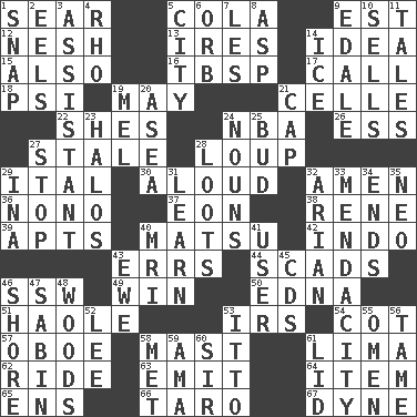 ACROSS 1. Wither 5. Root beer relative 9. Eastern Standard Time (abbr.) 12. Tender 13. Angers 14. The main thing one is thinking about 15. In addition 16. Cook's measure (abbr.) 17. Give a ring to 18. Air pressure measure (abbr.) 19. Fifth month 21. Cell (Danish) 22. "______ My Girl" (Turtles hit) 24. Basketball assoc. 26. Double-curved letter 27. Lacking originality or spontaneity 28. Central Nebraska county 29. Slanted text style (abbr.) 30. Verbally 32. So be it 36. Words to Nanette 37. A really long time 38. French philosopher Descartes 39. Tenement units (abbr.) 40. Taiwanese island in East China Sea 42. Southeast Asian peninsula 43. Blunders 44. Oodles 46. Compass dir. 49. Victory 50. Pulitzer Prize-winning author Ferber 51. White Person, in Hawaii 53. Big collection agency 54. Small bed 57. Mitch Miller's instrument 58. Vertical spar for supporting sails 61. Pale green bean 62. Travel on or in a vehicle 63. Send forth 64. A whole individual unit 65. Followers of ems 66. Pacific island yam 67. Centimeter-gram-second unit of force DOWN 1. Fastener 2. Snakelike fish 3. Aide 4. 17th letter of the Greek alphabet 5. Municipality 6. Globe 7. French article 8. Cleo's killer 9. Peak District village in England 10. Exchanges for money 11. Falsehoods 14. Frozen water 19. Cartoonist voice _ Blanc 20. Toward the sea 21. Head covering 23. Auras 24. Parts of speech 25. Partially opened flower 27. Halt 28. Plunders 29. _ tizzy (2 wds.) 31. Acquire or gain knowledge or skills 32. Believer in; advocate of (suffix) 33. Ananias' fault 34. Conclusions 35. Modern: prefix 40. Medical imaging device (abbr.) 41. One who makes use of a thing 43. She-sheep 45. Music discs 46. Dinah or Pauly 47. Unit of acoustic absorption 48. Forest 52. Area sheltered from the wind 53. "Tell ____ the Marines!" 55. Sign of something about to happen 56. Docile 58. Was introduced to 59. Housemaid (var.) 60. Title for a knight 61. Hat (slang)