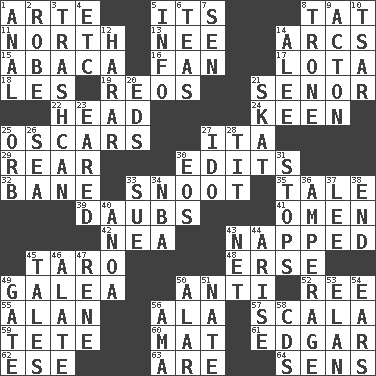 ACROSS 1. Johnson of "Laugh-In" 5. ___ a Wonderful Life 8. Make lace 11. 0 degrees 13. Born 14. Arches 15. Phillipine bananalike plant 16. Avid follower 17. Globular water bottle used in Asia 18. French article 19. Vintage cars 21. Sir (Sp.) 22. Froth on beer 24. Peachy ____! 25. Motion picture awards 27. Call ___ day 29. Posterior 30. Proofreads 32. Object of repulsion 33. Snout, nose 35. Story 39. Applies to a surface 41. Sign of something about to happen 42. Teachers' org. 43. Slept 45. Edible starchy tuberous root 48. Celtic language 49. An organ shaped like a helmet 50. Opposed to 52. To riddle 55. Actor Alda or Thicke 56. Wing 57. Any of the three canals of the cochlea 59. False hair 60. Floor covering 61. _ Allan Poe 62. Compass dir. 63. "We ___ not amused" (Victoria) 64. Elected reps. DOWN 1. Of or related to the anus 2. Loose flowing garment 3. File 13 4. And so on (abbr.) 5. Information 6. Beverages made from leaves 7. Elected rep. 8. Heavy duty weighing machine 9. NE Massachussets city 10. Russian ruler of old 12. Ethiopian city, capital of Harari 14. Toward shelter 20. Begley and Asner 21. Three-handed card game 23. Having ears or earlike features 25. Globe 26. Ocean 27. Wedding promise 28. Teat (slang) 30. Greek goddess of the dawn 31. Halts 33. Take to court 34. Basketball assoc. 36. Electrical Measurement 37. Area sheltered from the wind 38. Conclude 40. Small Philippine buffalo 43. Remaining after all deductions 44. Originate 45. Stories 46. Having winglike extensions 47. French philosopher Descartes 49. Yard entry 50. Having or resembling wings 51. Nathan's nickname 53. Enthusiasm 54. Hearing organs 56. Housemaid (var.) 58. Music discs