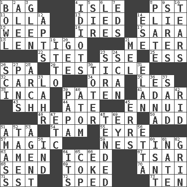ACROSS 1. Paper or plastic container 4. Capri or Wight 8. Pacific Standard Time (abbr.) 11. Water jar 13. Passed on 14. Writer Wiesel 15. Shed a tear 16. Angers 17. "Two Mules for Sister ____" 18. Small, flat, pigmented spot on the skin 21. Distance measurement 22. Proofreading order 23. Compass dir. 25. Double-curved letter 26. Health resort 29. One of the two male reproductive glands 32. Monte _, Las Vegas Hotel/Casino 34. Mouth or opening 35. French article 38. South American Indian 39. Eucharist need 41. The sixth month of the Jewish calendar 43. Quiet! 44. Had dinner 45. World-weariness 46. Newsperson 50. Increase 51. "One Day ___ Time" 54. Scottish cap 55. Jane of fiction 57. Mysterious quality of enchantment 59. Snuggling 63. So be it 64. On the rocks 67. Russian ruler of old 68. Transmit 69. Puff or smoke 70. Against 71. Fast jet (abbr.) 72. Drove too fast 73. "___ Little Indians" DOWN 1. Soup holder 2. Toward shelter 3. Small, secluded valley 4. Foolish or stupid persons 5. Title for a knight 6. Area sheltered from the wind 7. Begley and Asner 8. Food holder 9. Male parents of animals 10. Lacerates 12. Flats, for short 14. Compass dir. 19. "Tell ____ the Marines!" 20. Turn to the right 21. Cartoonist voice _ Blanc 23. Beget 24. Glance over 26. _-fi 27. Baking dishes 28. Bowlike part 30. Carrier 31. Flair 33. Cowardly lion portrayer 36. Pulitzer Prize-winning author Ferber 37. Saudi Arabian king (1953-1964) 39. Dad 40. Tiny particle 42. To free from 45. Blunders 47. And so on (abbr.) 48. Looked after 49. Sight organ 51. Collect or gather 52. Domesticates 53. Rep 56. Singer James 58. Indiana (abbr.) 60. Is not 61. Nathan's nickname 62. Broad smile 64. ___ a Wonderful Life 65. Police officer (slang) 66. Supplement with great effort