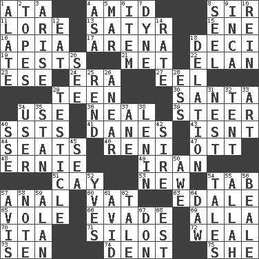 ACROSS 1. "One Day ___ Time" 4. Among 8. Title for a knight 11. Old wives' tales, e.g. 13. Man with strong sexual desires 15. Compass dir. 16. Capital of Western Samoa 17. Sports stadium 18. Tenth: prefix 19. Trials 21. Was introduced to 22. Style 23. Compass dir. 24. Epoch 27. Snakelike fish 29. Adolescent 30. Before Barbara or Clara 34. Purpose 36. Be tempered by heat 39. Navigate 40. Fast planes 41. Natives or inhabitants of Denmark 43. Is not 44. Theater features 46. Painter Guido (1575-1642) 47. Baseball player Mel 48. Bert's buddy 49. SW Asia republic 51. Island 53. ___ Haven, CT 54. Keyboard key 57. Of or related to the anus 60. Large container 63. Peak District village in England 65. Short-tailed, large-bodied rat 66. Elude 69. Silent film actress Nazimova 70. Call ___ day 71. Grain storage towers 72. Welt 73. Elected rep. 74. Gouge 75. A female animal or person DOWN 1. Having winglike extensions 2. Drinks excessively 3. Originate 4. White ___ sheet 5. Third mo. 6. A whole individual unit 7. Centimeter-gram-second unit of force 8. Sew up the eyelids of hawks and falcons 9. South American Indian 10. It's straight from the horse's mouth 12. Consume 14. Pace 18. Accusation by an informer 20. Observe 25. Tear apart 26. Approach 28. Double-curved letter 29. One of the two male reproductive glands 31. Egg locale 32. Portable shelter 33. Nonscientific branch of learning 34. One who makes use of a thing 35. Comedian Laurel of Laurel & Hardy 37. One (Scot) 38. Soviet premier 1918-24 40. Compass dir. 42. Male parent of an animal 45. Ocean 50. Deep reverence 52. Jacques Cousteau's middle name 54. Falsehoods 55. Assad's deity 56. Memphis, Tenn. Street 57. Deliberation 58. Brief written record 59. Actor Alda or Thicke 61. Enthusiastic 62. Lie 64. Fool 67. Spanish title 68. Eastern Standard Time (abbr.)