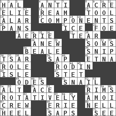ACROSS 1. Actor Linden 4. Against 8. Measure of real estate 12. Writer Wiesel 14. 480, 500 or 516 sheets of paper 15. Instrument 16. Having or resembling wings 17. Pieces 20. Zero-star reviews 21. Frozen water 22. Enemy 23. Nest on high 27. Separate forcefully 29. Afresh 31. Sty mamas 34. Memphis, Tenn. Street 35. Sever or remove by pinching or nipping 36. Russian ruler of old 39. Plant excrement 41. Inactive volcano in Sicily 42. Hero or heavy, e.g. 43. "The Thinker" sculptor 46. Capri or Wight 47. Proofreading order 48. Lyric poems 51. Slow-paced one 54. The first octave above the treble staff 56. Adept person 58. Basketball hoops 61. Happening in regular succession 66. Mine, in Marseilles 67. Ship's personnel 68. One of the Great Lakes 69. 1994 drama film starring Jodie Foster 70. Person who is morally reprehensible 71. Plant excrements 72. Perceive with the eye DOWN 1. Pile 2. Silent film actress Nazimova 3. Climbing, woody, usually tropical vines 4. Curve 5. Modern: prefix 6. Scottish cap 7. Body of Kaffir warriors 8. Had dinner 9. Meet 10. Printing process, for short 11. Otherwise 13. Celtic language 18. Sep. follower 19. Born 24. Actress Charlotte 25. _ tizzy (2 wds.) 26. Snakelike fish 28. NE Netherlands city 30. Puts on (as clothing) 32. Victory 33. Health resort 34. A special lineage 36. Three (prefix) 37. Mayday 38. One to whom something is allotted 40. Cooking vessels 44. Lair 45. Call ___ day 49. Consume 50. _-fi 52. SW Asia republic 53. Citrus fruits 54. Bowlike part 55. Old wives' tales, e.g. 57. Nights before holidays 59. Undercover agent 60. Filth; sediment 62. Leather borer 63. Period 64. Mouth edge 65. Affirmative reply