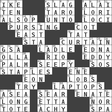 ACROSS 1. Eisenhower's nickname 4. Volcanic refuse 8. Jai _ 12. Nine, plus one 13. Pacific island yam 14. Australian parrot (variant) 15. Columnist Joseph or Stewart 18. To (old English) 19. Venues 20. Puckering 22. Small bed 23. 90 degrees 24. Make lace 25. R.R. building 26. Window treatment 30. Girls' org. (abbr.) 33. Dipping utensil 36. Pulitzer Prize-winning author Ferber 37. Spanish pot 39. _ de Janeiro 40. Whirlpool 41. Inside of hand 42. Oozy 44. Distress signal 45. Paper fasteners 47. Compass dir. 50. A really long time 51. Tennis shots 53. Attempt to accomplish something 54. Portable computers 57. Toward the sea 59. Wither 61. Related on the mother's side 63. Having great length 64. Singer James 65. Not either 66. Carryall 67. Painful 68. Health resort DOWN 1. Call ___ day 2. Seaweed 3. Take place subsequently 4. Surprise greatly 5. Austrian-born American filmmaker Fritz 6. Nonscientific branch of learning 7. Thick or sticky substance 8. One to whom something is allotted 9. Plunder 10. Curve 11. One more than two 16. Mouths or openings 17. Inconspicuous attention getter 21. Slanted text style (abbr.) 22. Auto 24. Third day of the wk. 26. Hoof sound 27. Sums up 28. _ china 29. Negative votes 30. Republicans 31. Narrow board 32. Silent film actress Nazimova 34. Ancient Greek god of war 35. Pass on 38. Electrical Measurement 42. Elected rep. 43. Sharp bark 46. Myrna of the movies 48. Make mention of 49. Inky black, to poets 52. Connects, as a bridge 53. Portable shelter 54. Thin strip of wood or metal 55. Like ___ of sunshine 56. Constrict 57. Keyboard modifier key 58. "Barney Miller" actor Jack 59. Ocean 60. And so on (abbr.) 62. Epoch