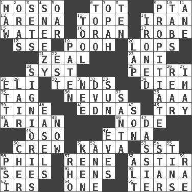 ACROSS 1. With motion or animation 6. Small child 9. Parent Teacher Association (abbr.) 12. Sports stadium 13. Drink excessively 14. SW Asia republic 15. Wetness 16. Northwest Algerian city 17. Loose flowing garment 18. Compass dir. 19. "Silly old bear" 20. Chops off 21. Ardor 23. Black tropical American cuckoo 24. System (abbr.) 25. _ dish (used to culture cells) 28. Connecticut Ivy Leaguer 30. Is inclined (to) 34. South Vietnam president (1954) 35. Label 36. Congenital growth or mark on the skin 38. Auto club (abbr.) 39. Prong on a fork 41. Ferber et al. 43. Attempt to accomplish something 44. Believer in; advocate of (suffix) 46. Thickened enlargement 48. Bear (Spanish) 49. Inactive volcano in Sicily 50. Group working together 51. Polynesian shrub of the pepper family 53. Fast jet (abbr.) 56. Silvers or Donahue 57. French philosopher Descartes 58. Being in motion 60. Perceives with the eye 61. Coop moms 62. Woody, climbing, usually tropical plant 63. Big collection agency 64. Single 65. Laconic DOWN 1. Informal term for the mouth 2. Mouths or openings 3. Arranges properly for use 4. Dwarf with a sinus problem 5. Boat paddle 6. "Corrida" creature 7. Brightly colored fish 8. "___ Little Indians" 9. Conciliate 10. Bar bills 11. One (Scot) 13. Utensil 14. Pressed 19. Eucharist need 20. Pet locale 22. Eastern Standard Time (abbr.) 24. Seigniories (variant) 26. Posterior 27. "If ____ say so..." 28. Singer James 29. Den 31. Born 32. Movie disc 33. Player for Phoenix 37. Before Barbara or Clara 40. Artist's stands 42. Male child 45. Immediately 47. Hyrax 49. Nights before holidays 50. "Mermaids" star 51. Peachy ____! 52. Queen of England 1702-14 54. Play the lead 55. Airtight sealed metal containers 56. 23rd letter of the Greek alphabet 57. 17th letter of the Greek alphabet 58. The first octave above the treble staff 59. Actress Charlotte