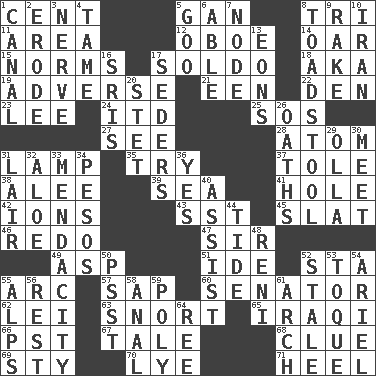 ACROSS 1. Penny 5. Separate the seeds from cotton 8. Three (prefix) 11. Type of rug 12. Mitch Miller's instrument 14. Rowing implement 15. Typical standards 17. Twentieth part of a lira 18. Alias (abbr.) 19. Contrary to your interests or welfare 21. Car or cant ending 22. Lair 23. Area sheltered from the wind 24. It would 25. Mayday 27. Perceive with the eye 28. Smallest unit of an element 31. Desk light 35. Attempt 37. Lacquered or enameled metalware 38. Toward shelter 39. Ocean 41. Opening into or through something 42. Charged particles 43. Fast jet (abbr.) 45. Narrow board 46. Make new 47. Title for a knight 49. Viper 51. Binary compound 52. R.R. building 55. Curve 57. Plant excrement 60. Elected representative 62. Flowery wreath 63. Derisive sound 65. Resident of Iraq 66. Pacific Standard Time (abbr.) 67. Falsehood 68. A slight indication 69. Filthy place 70. Sodium hydroxide 71. The bottom of a shoe or boot DOWN 1. Lessep's creation 2. Eat (away) 3. Effrontery 4. Not wild 5. Thick or sticky substance 6. Competent 7. Connecting point 8. Inedible or poisonous agaric 9. Libertine 10. SW Asia republic 13. Immeasurably long periods of time 16. Indian titles of respect 17. Spring feasts 20. Proofreading order 26. Profane or obscene expressions 29. Water jar 30. Rendezvous 31. Den 32. _ vera 33. Ananias' fault 34. Mexican monetary units 36. It is so 40. Aid 44. Event that recurs at intervals 48. Painter Guido (1575-1642) 50. Inconspicuous attention getter 52. Lacking originality or spontaneity 53. Woman's close-fitting hat 54. Satellite of Uranus 55. High mountains 56. State of inaction 58. Of or related to the anus 59. More than one (prefix) 61. Bowlike part 64. To riddle