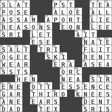ACROSS 1. Narrow board 5. Pacific Standard Time (abbr.) 8. Beverage made from leaves 11. Introduce or present, as a question 12. Medicinal plant 14. 100% 15. Indian state 17. To the left, to Queeg 18. Whopper 19. Thinks logically 21. A really long time 22. Area sheltered from the wind 23. Indian title of respect (Mr.) 24. Allow 25. Small island 27. Compass dir. 28. Nathan's nickname 31. Table seasoning 35. Three (prefix) 37. Sudden quick movement 38. Double curve, resembling the letter S 39. What Jean-Claude Killy likes to do 41. Monthly bill 42. Put on (as clothing) 43. Period 45. At sea 46. Fast planes 47. The grampus (Milton) 49. Layer 51. Teachers' org. 52. Title for a knight 55. Compass dir. 57. Baseball player Mel 60. Gist 62. Slender fish 63. One of three equal parts 65. Leg joints 66. One (Scot) 67. Hearing organs 68. Gouge 69. June honoree 70. John Ritter's dad 71. Indian titles of respect DOWN 1. Practice fights 2. Failure 3. Slender Brazilian palm 4. Afternoon social gatherings 5. Infant food 6. A type of plum 7. "Corrida" creature 8. Baron Munchausen's specialties 9. Writer Wiesel 10. Toward shelter 13. Inactive volcano in Sicily 16. Undercover agent 17. Michaelmas daisies 20. A home for chicks 26. Kind of red light 29. Prong on a fork 30. Singer James 31. Sty mamas 32. Eras 33. Tough but pliablecoriaceous 34. Laconic 36. Eisenhower's nickname 40. Pressed 44. Ancient Greek god of war 48. Keg 50. Make mention of 52. Contemptuous expression 53. Ancient Celtic tribe of eastern Britain 54. Musical pauses 55. Mild oath 56. Grandmother 58. Not this but _ 59. Become fatigued 61. Extremities 64. Acura sports coupe